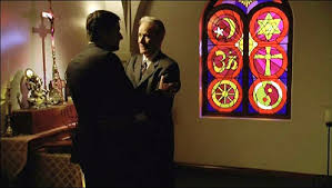 It was an inspired bit of theatre: having a stained glass window displaying six symbols of the world’s main religions. No doubt the producers wanted to be inclusive of all faiths when they decided to let this image be shown. Did you ever wonder why? I think they didn’t want to offend any of their fan base.