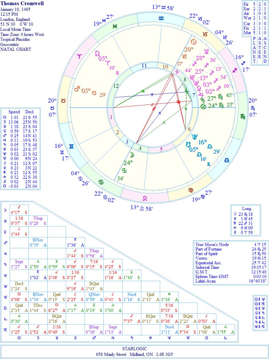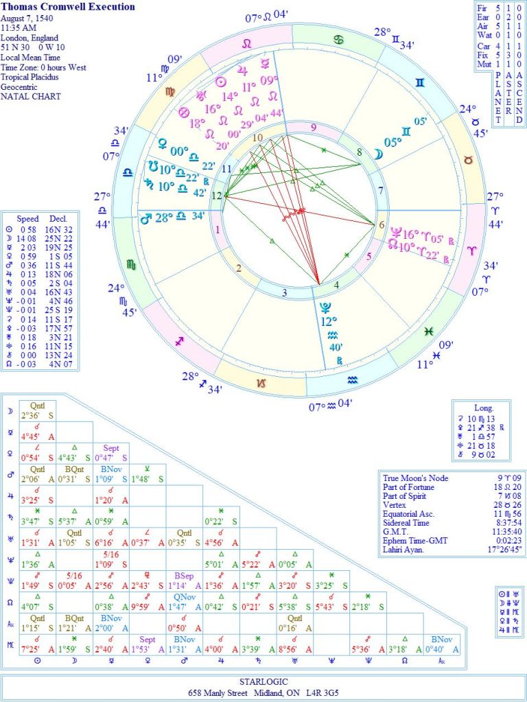 Notice how Pluto in Aquarius is in opposition to the Midheaven, Mercury, Jupiter, the Sun, and Uranus, all in Leo. The system was stacked against him, he didn’t stand a chance in hell. It has been noted that later, Henry VIII regretted losing such a valuable member of his government.