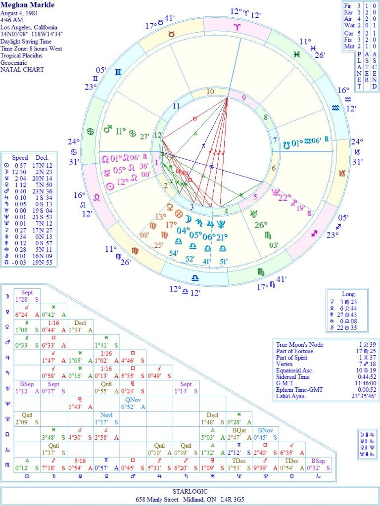 The timing of Meghan’s birth is considered good. I won’t disagree. The Cancer Ascendant gives her a soft spot for motherhood, and also having her feelings hurt badly. There are two inconjuncts.