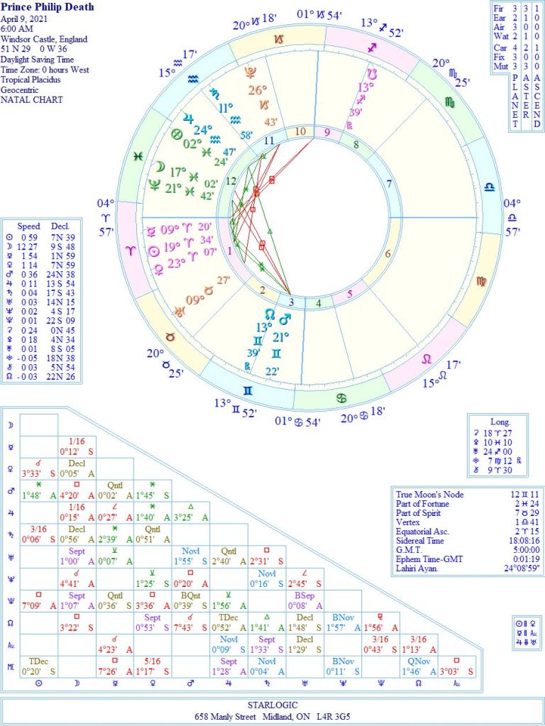 Comparing Philip’s birth and death charts, we can see how the timing is more accurate than I first imagined: the ‘event’ Ascendant is now directly opposite his natal Midheaven, and Mars is transiting his natal Sun. At least it was a peaceful transition.