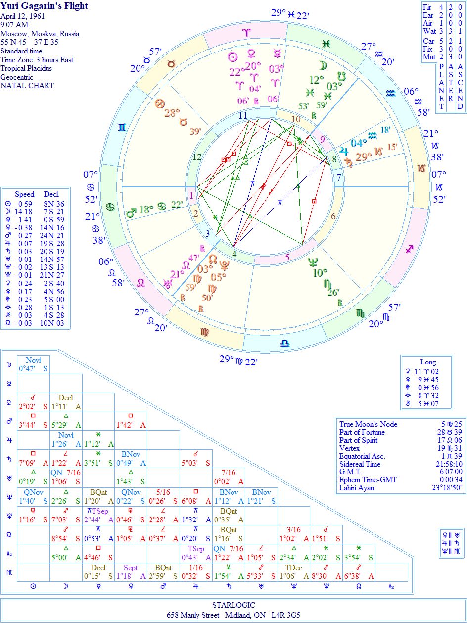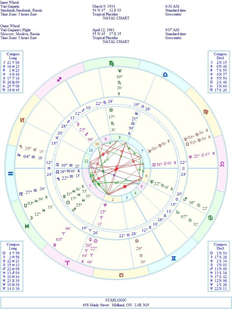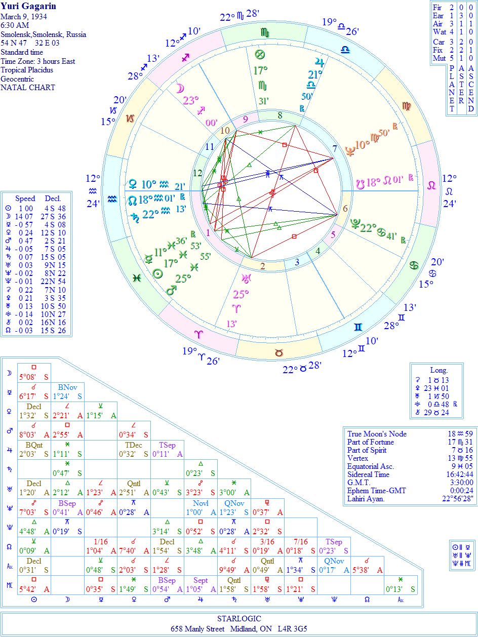 My Kepler 7.0 program lists the time of Gagarin’s birth as ‘conflicting/unverified’. But it may be correct nevertheless. The two inconjuncts tell a story on their own: Neptune inconjunct Venus/Ascendant speaks of his mysterious popularity; and Saturn inconjunct Pluto shows that he was destined to ‘escape’ the restriction of gravity. His death was not unexpected by the Soviets, so they ‘grounded’ him from further space exploration, while making him an international Russian hero. No matter, what was fated to occur, did anyway.