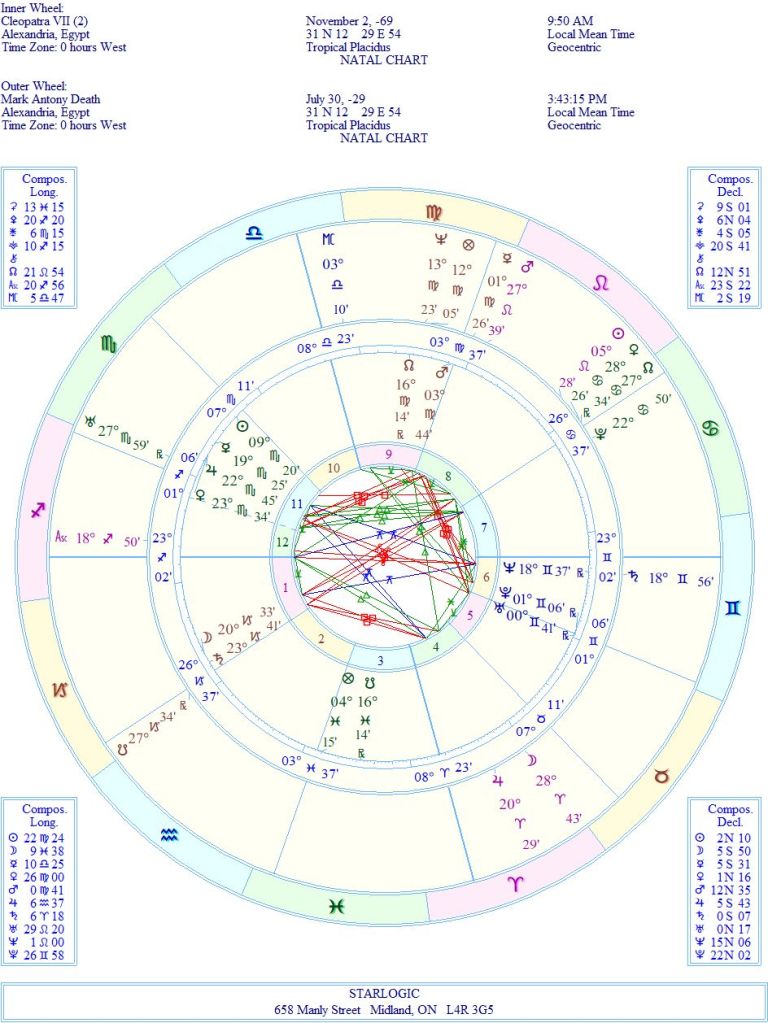 Cleopatra’s successful suicide has (for our purposes) an Ascendant @ 9° Pisces, in exactly the same place as Antony’s Mars. (And just so you don’t think I’m barking mad, consider the fact that in reality, there is no time. His sword was turned on himself, motivated by her death.)