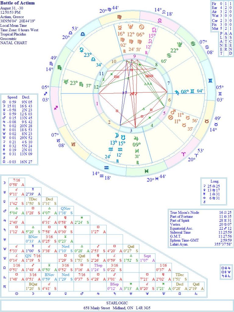 Jupiter is the base of the cosmic cross formed by the planetary positions of this chart. As Jupiter is @ 9° Pisces, I suspect this represents Antony. The Sun/Mercury/Neptune conjunction at the apex is most certainly Cleopatra, because she has the most to lose if the battle goes against her. The opposition between the Ascendant and Saturn would therefore be connected to Octavian. At approximately this time, his forces were starting to turn the tide, as it were.