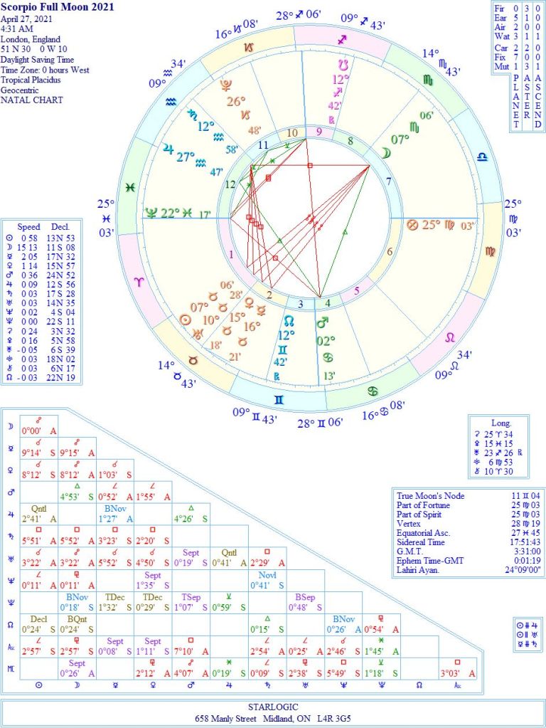 Interesting thought: every year around this time, we get to see a full Scorpio moon in the night sky. Last night, at about 11:31 pm locally, the Moon was exactly opposite the Sun. Some astrologers see this as a time to stand up to the creeping lockstep of government control with regards to the pandemic and the draconian methods used to keep people from protesting. That’s one interpretation. But only by looking at the exact moment astrologically, can we see: