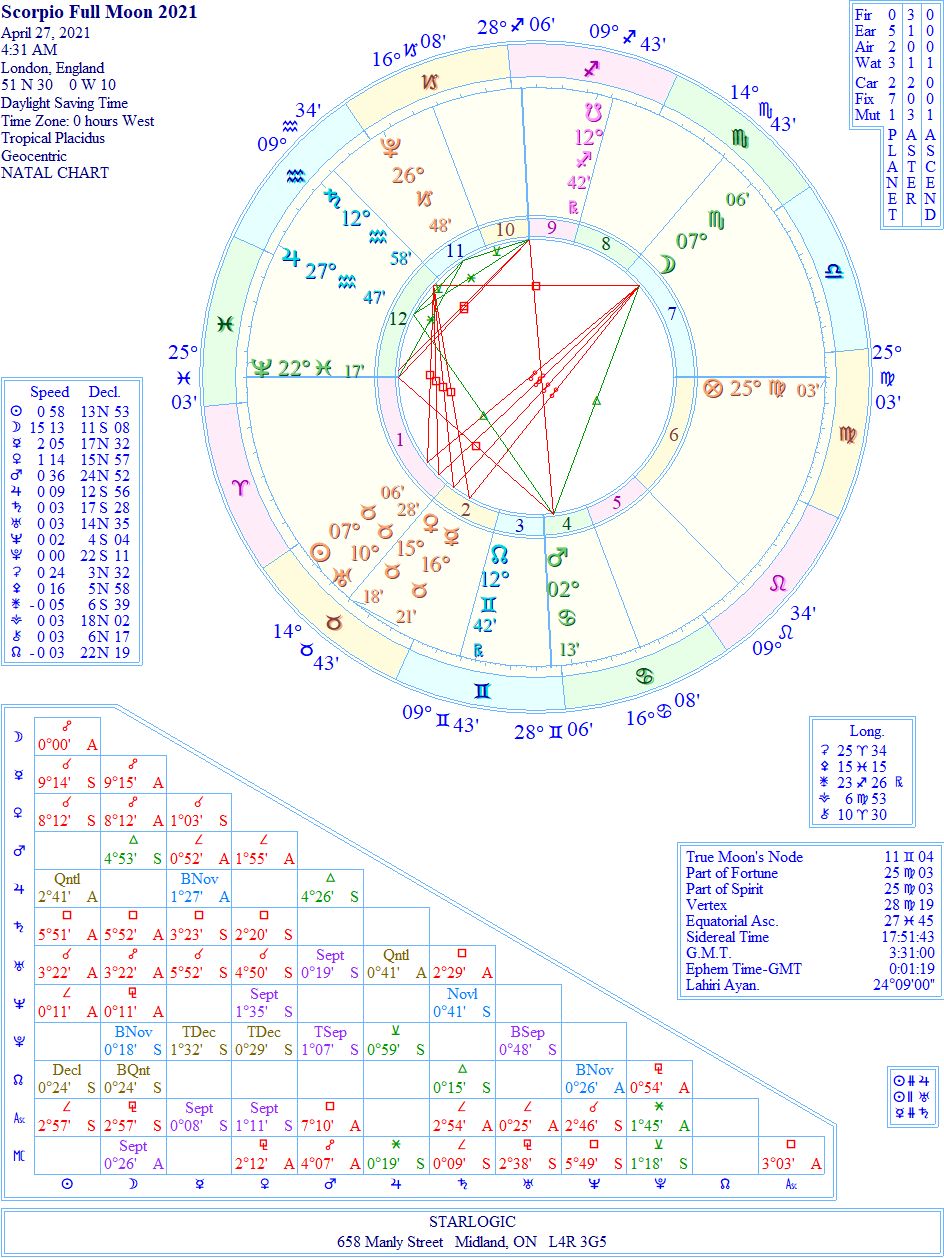 Interesting thought: every year around this time, we get to see a full Scorpio moon in the night sky. Last night, at about 11:31 pm locally, the Moon was exactly opposite the Sun. Some astrologers see this as a time to stand up to the creeping lockstep of government control with regards to the pandemic and the draconian methods used to keep people from protesting. That’s one interpretation. But only by looking at the exact moment astrologically, can we see:
