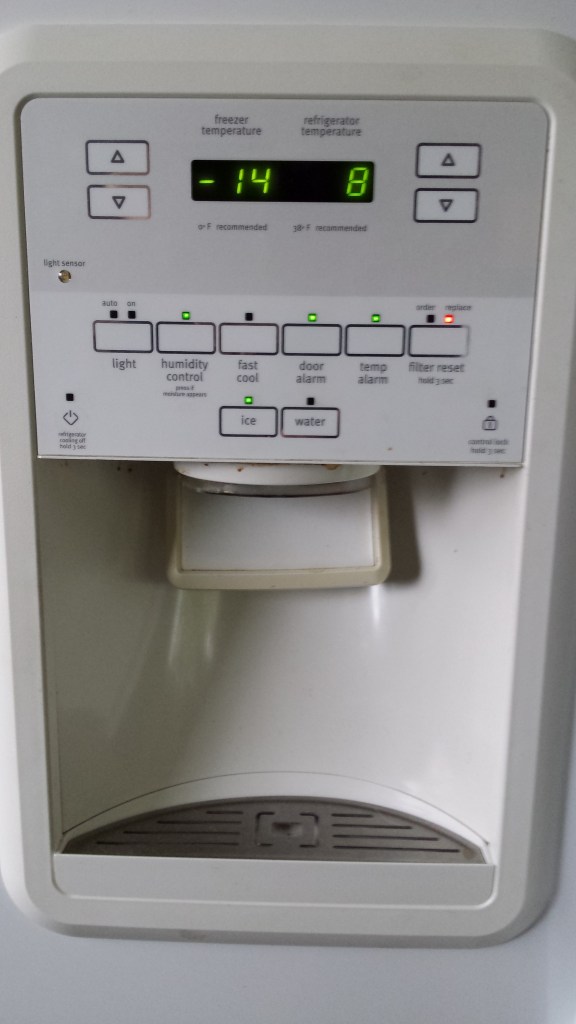 We got a local technician to come and give us a quote, even though we were in lockdown at the time. He advised us not to get the motherboard replaced, due to the age of the fridge and the difficulty of getting the needed parts. And the price would have been prohibitive, as we had learned when it happened once before. The fridge, however, was maintaining its cold temperatures in the main part and the freezer below, so we left it alone.