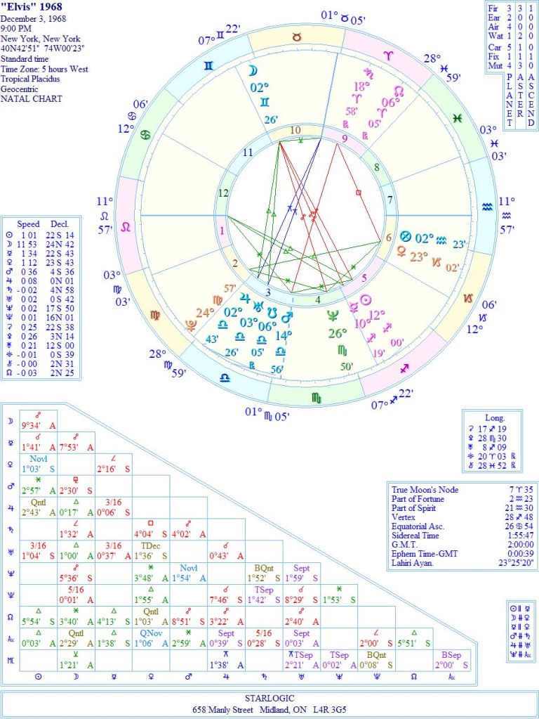 Inspired, or what? The ‘event’ Sun is almost exactly conjunct Elvis’ Ascendant @ 12° Sagittarius. The ‘event’ Mars and Elvis’ natal Mars are about 2° conjunct in Libra. And the ‘event’ Venus is conjunct Elvis’ natal Mercury @ 23° Capricorn, which also triggers his natal Sun and Part of Fortune. Finally, the ‘event’ Midheaven is conjunct Elvis’ natal Uranus in the last degrees of Aries. Could chance alone have determined this fortuitous happening? I think not.