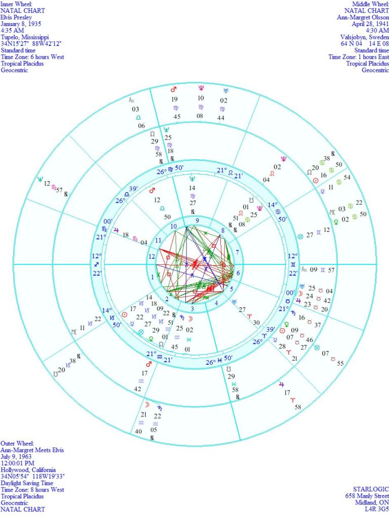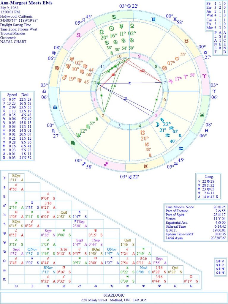 So, is it an accident, or fate? I would suggest fate because of the ‘accidental’ timing of the ‘event’ Ascendant, although that could change as the day wears on. It is conjunct Ann-Margret’s North Node, which we noted previously is also conjunct Ann-Margret’s Neptune and Elvis’ Midheaven. It’s obvious, isn’t it? Elvis needed Ann-Margret, and she needed him.