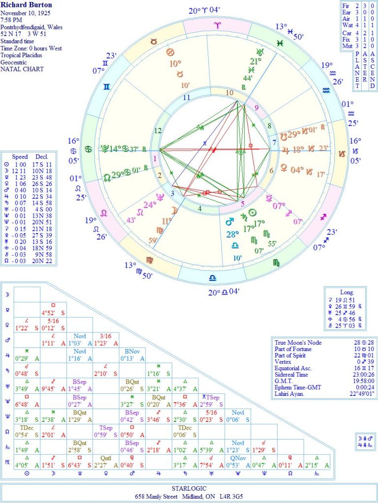 That stellium of five planets and the Ascendant in Aquarius was profound, to say the least. And, in my estimation, the person most affected was Elizabeth. (Her Saturn is conjunct the ‘event’ Sun/Mercury/Saturn/Ascendant conjunction: it would have been as if she had met and fell in love with her ‘father-figure’. And the ‘event’ Moon is conjunct her Part of Fortune @ 19° Leo, also the ‘event’ Part of Fortune AND North Node.) But Richard wasn’t immune, either. (His Moon which is conjunct her Neptune was being triggered by transiting Pluto @ 9° Virgo.) This movie was their coming together event as ordained by the Universe.