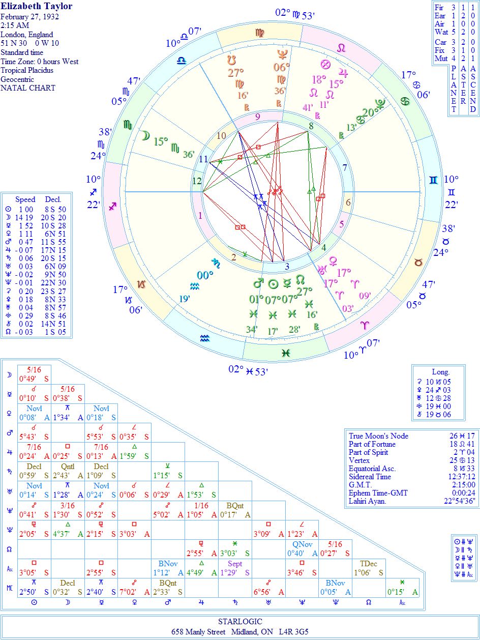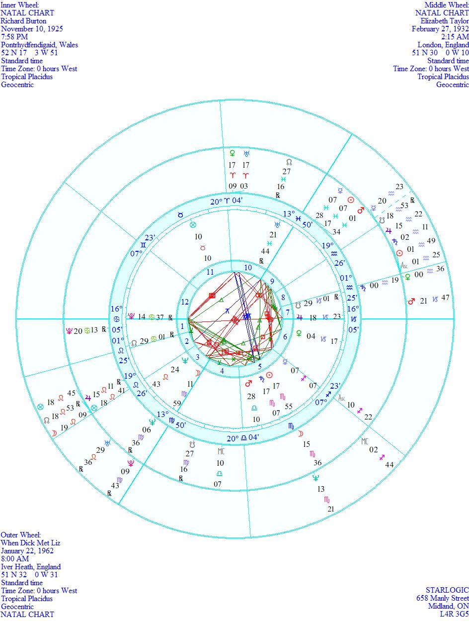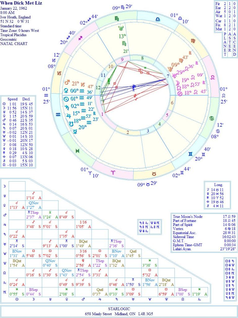 Their individual Moons are the reason for the connection between them. Liz’ Moon is conjunct Dick’s Sun/Saturn conjunction; Dick’s Moon is conjunct Liz’s Neptune and opposite her Sun/Mercury conjunction. Literally, 17° is also a prime factor as Dick’s Sun/Saturn conjunction in Scorpio is inconjunct Liz’ Venus/Uranus conjunction in Aries. Theirs was a journey, together.