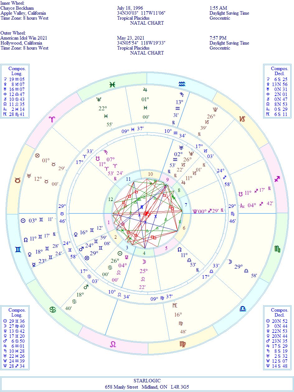 The ‘event’ Ascendant is exactly where Chayce’s age of ‘almost’ 25 should be. That confirms for me that my chart rectification of his birth time is as accurate as it can be without actually knowing. The ‘event’ Sun is within 4° of his own Ascendant. The two Venus placements are about 2° apart, while the ‘event’ Mercury and Chayce’s Mars are that close, too. The ‘kicker’ for me is that the ‘event’ Pluto is almost exactly conjunct Chayce’s Neptune (which still has the Yod from his birth chart now pointing to the ‘event’ Pluto), while a second interactive Yod is pointing at his Moon, with inconjuncts from the ‘event’ Pluto and the ‘event’ Neptune. To heck with what Robert Hand’s words say in that first aspect description above, there are stronger forces at work that he cannot control, and all Chayce has to do was surrender to that higher power, as stated in the second aspect description. And the ‘event’ Saturn is conjunct his Midheaven (his career 10th House) in Aquarius. So, there…
