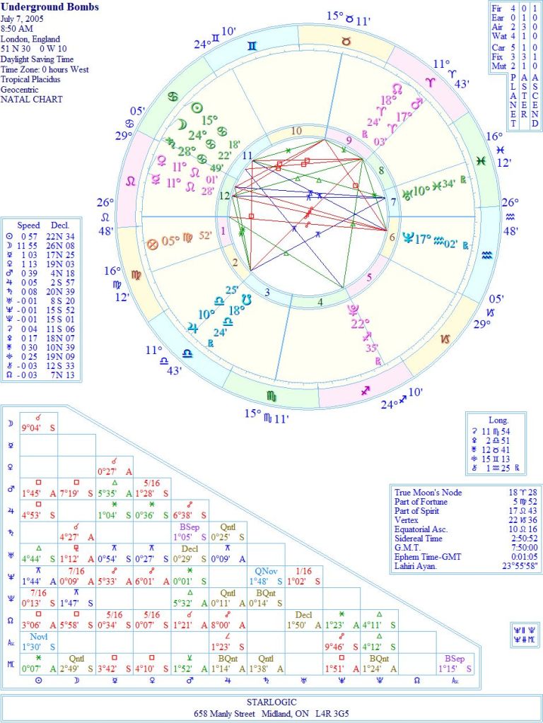 Until I saw there were five inconjuncts in the chart, I hadn’t considered that there might have a been a fifth conspirator. He (or she) might actually be the mastermind (Mercury Inconjunct Uranus). The others would have been following ‘orders’, but the ‘Jupiter Inconjunct Uranus’ individual will most likely have been the one that blew up the double-decker bus. Maybe he simply wanted to go his own way.