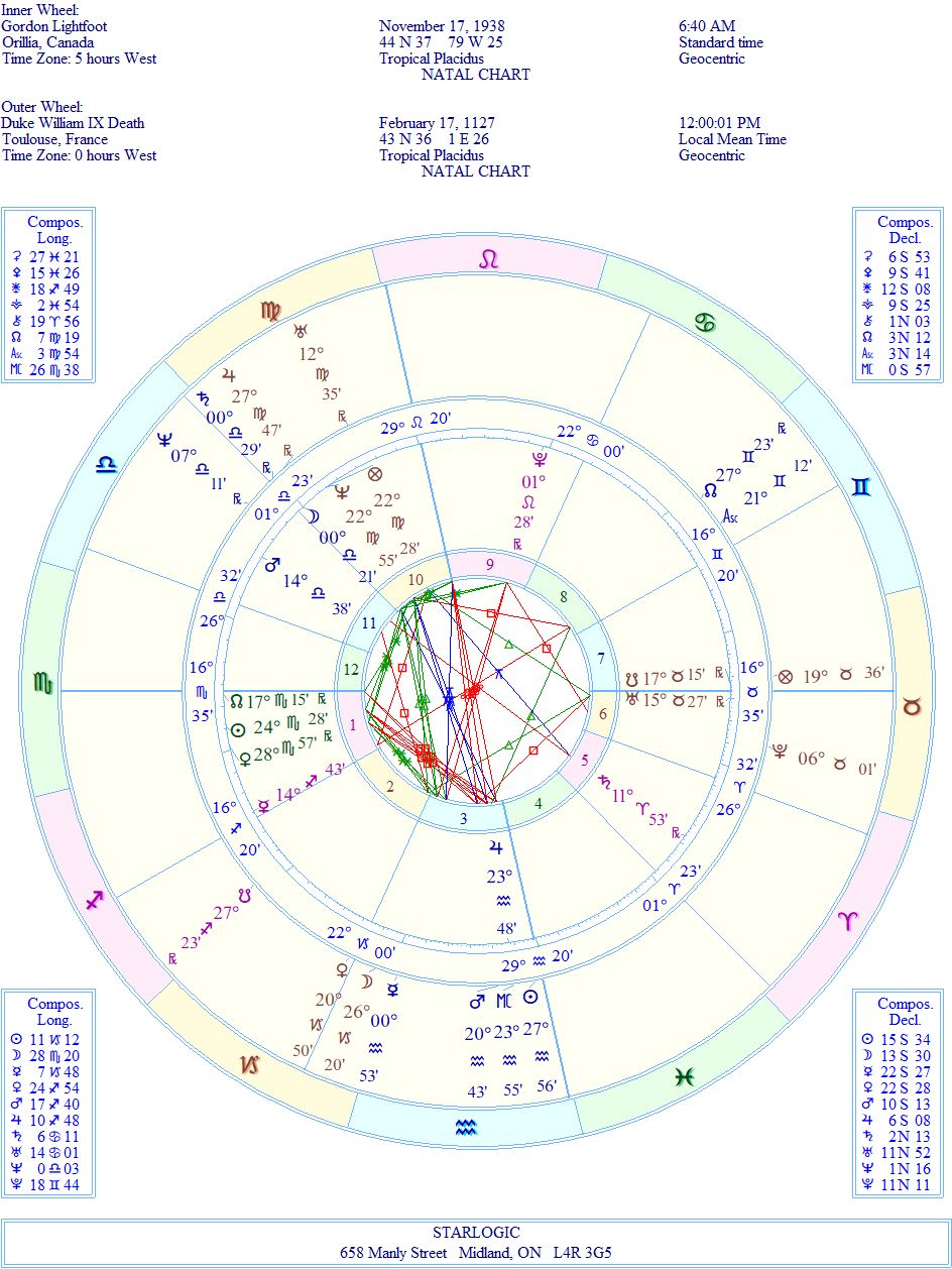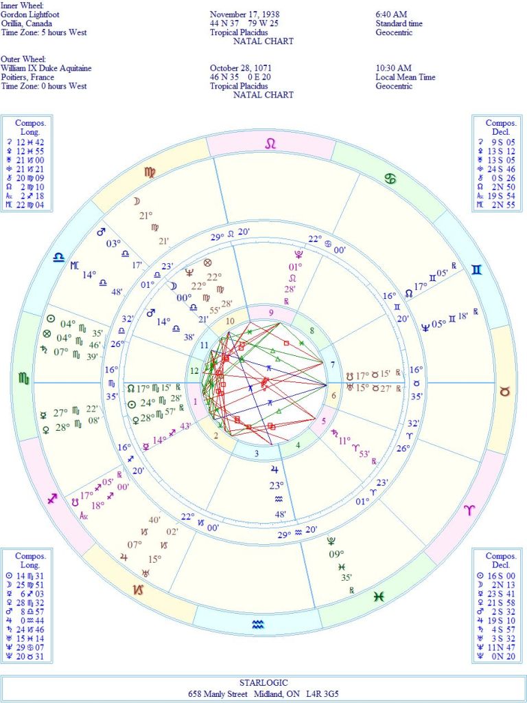 The Yod (Finger of God) pointing at Lightfoot’s Uranus/South Node in Taurus with inconjuncts from William IX’s South Node/Ascendant in Sagittarius and his Midheaven in Libra (also conjunct Gordon’s Mars) shows that these two are ‘totally’ connected. Now, please note, I am not saying that Lightfoot IS William IX reincarnated, but this is definitely suggestive of that idea. William’s Mercury/Venus conjunction in Scorpio is conjunct Gordon’s Sun/Venus conjunction. At the same time, Gordon’s Neptune/Part of Fortune in Virgo is in close conjunction to William’s Moon, while Gordon’s Moon in Libra is within 3° of William’s Mars.
