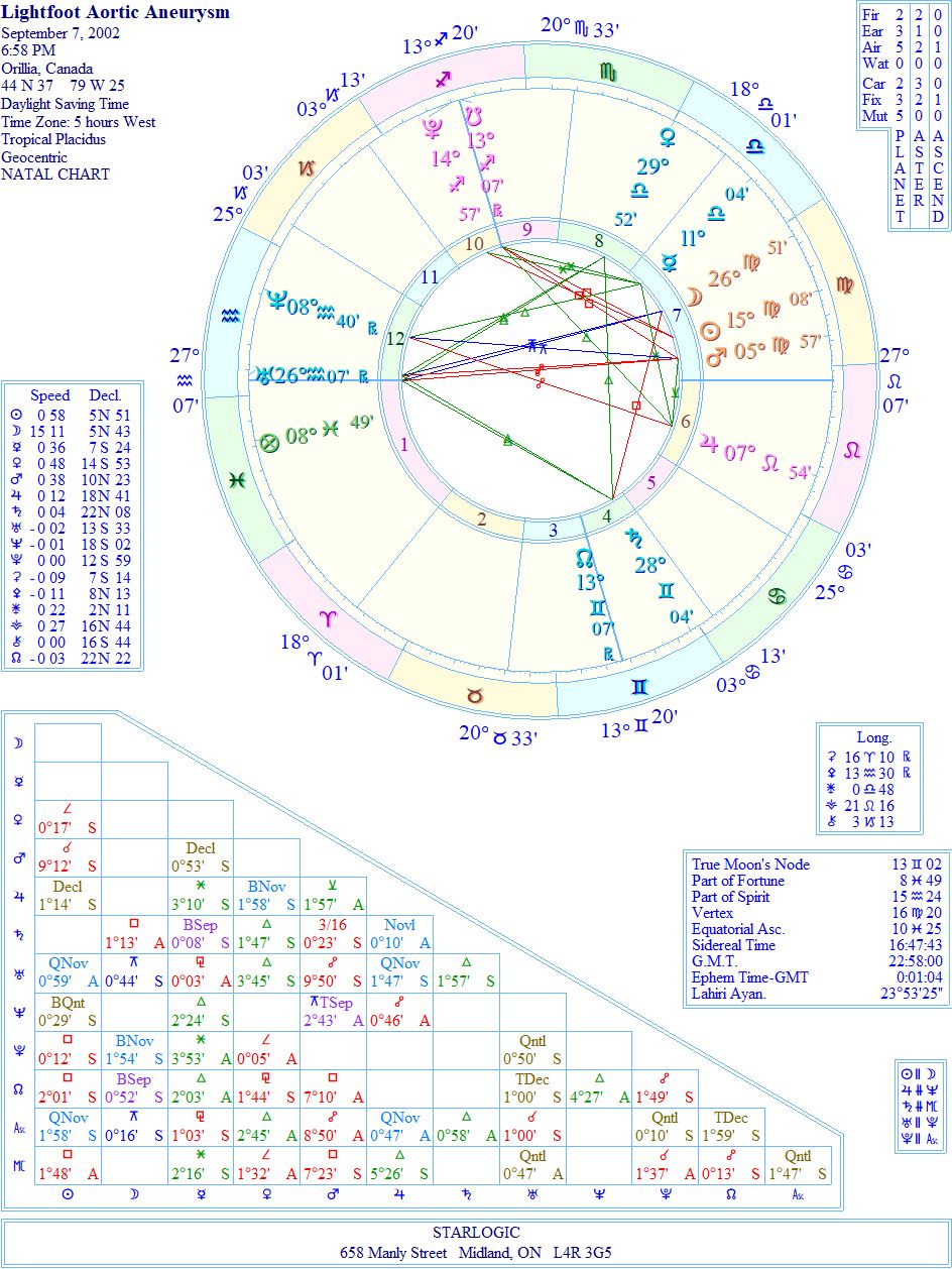 This may be pure astrological speculation on my part, but I believe the exact crisis point when the hospital staff ‘lost’ him and then brought him back was 6:58 pm. As Uranus was conjunct the Aquarius Ascendant at that point, my impression was of Gordon Lightfoot being greeted by a heavenly choir, even if it was only a few moments in terms of earthly time. (And as he’s never spoken of what happened during his six-and-a-half weeks in an induced coma, I can only quote what he said when he regained consciousness on Halloween:)