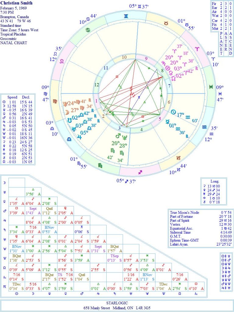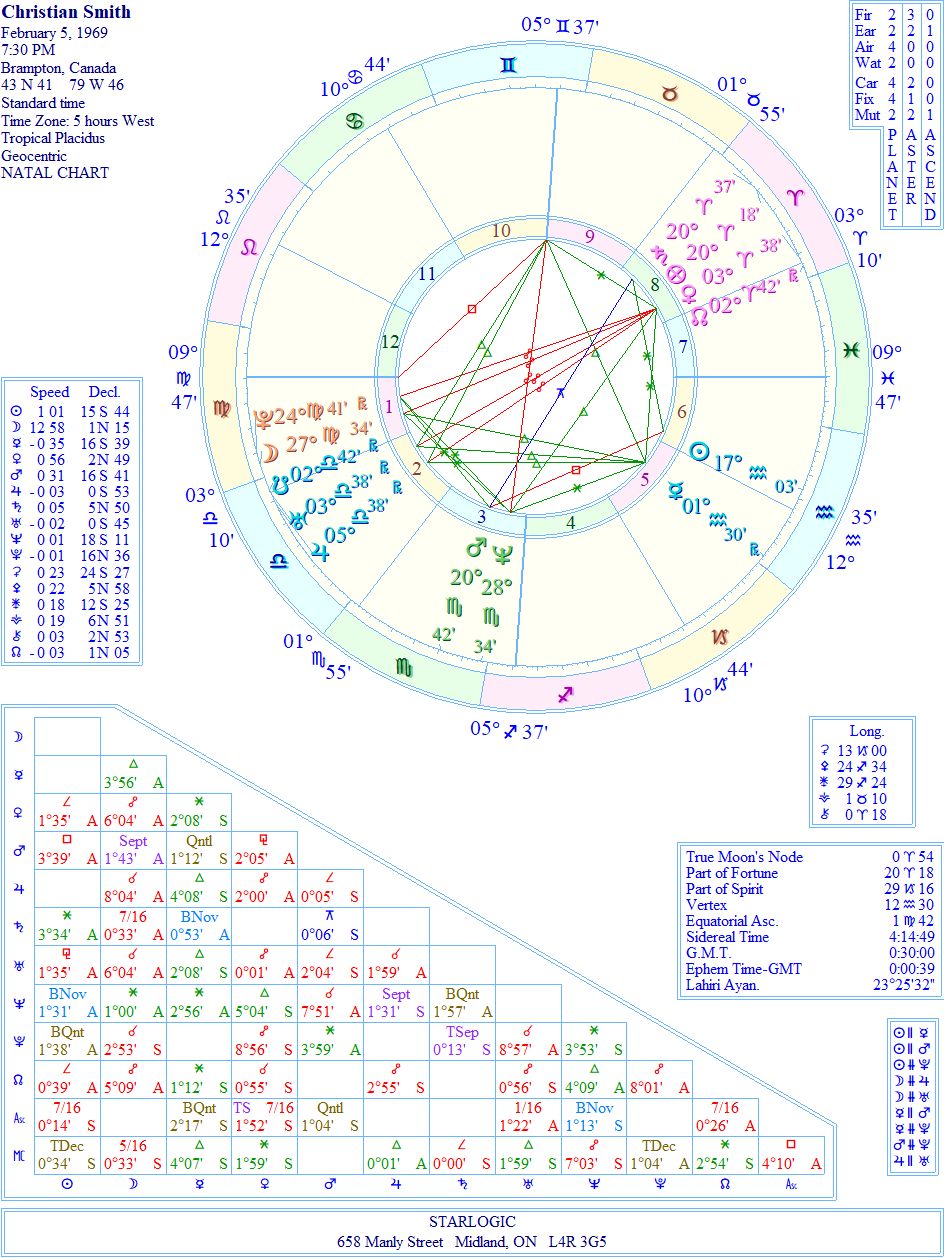 On page 40 of his book is this single sentence: I was born on February 5, 1969. Now, what astrologer do you know that could resist the temptation to explore what that person is really like? The place was Brampton, Ontario. The timing was a little more obscure, until you add up the incidents in his childhood which have had an effect on him. (That’s essentially what the book is about: his childhood memories of events in his mother’s psychic development.)