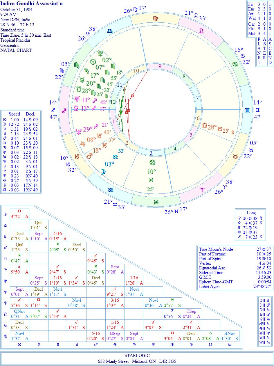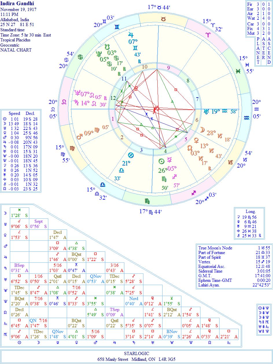 This chart was already on my Kepler 7.0 computer program, so I cannot confirm if the timing is accurate. I suspect it may not be correct, due to the fact that her assassination is not evident. But, again, it may be the placement of Chiron @ 25° Pisces in the 8th House which may be the ‘proof’ of that final event. So I will let the timing of her birth chart remain at 11:11 pm.