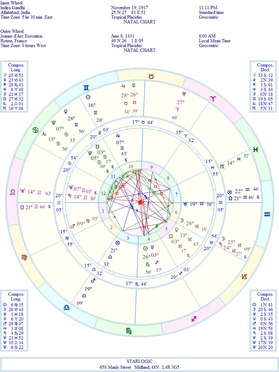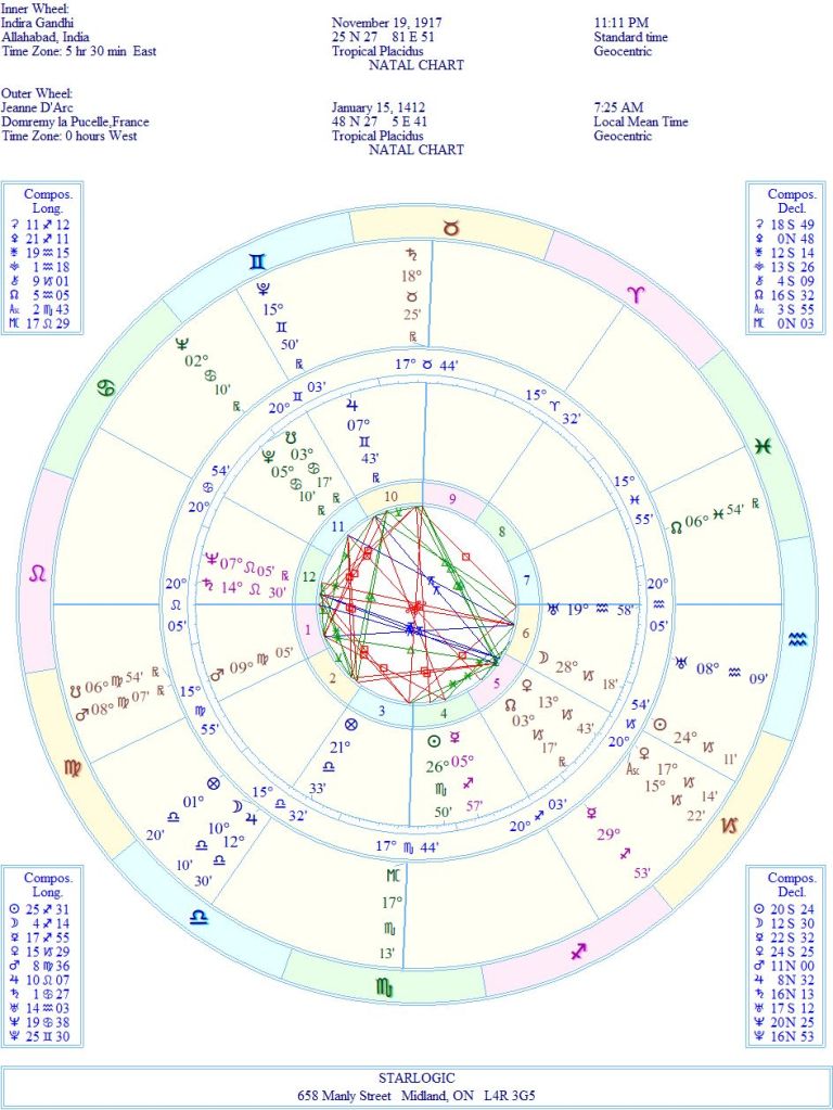 Other astrologers could definitely make a case for spiritual “overshadowing,” but Indira’s obsession with Jeanne’s life (and death) seems to be a recognition of her personal connection to the Maid of Orléans. They both ended up dying for their countries.