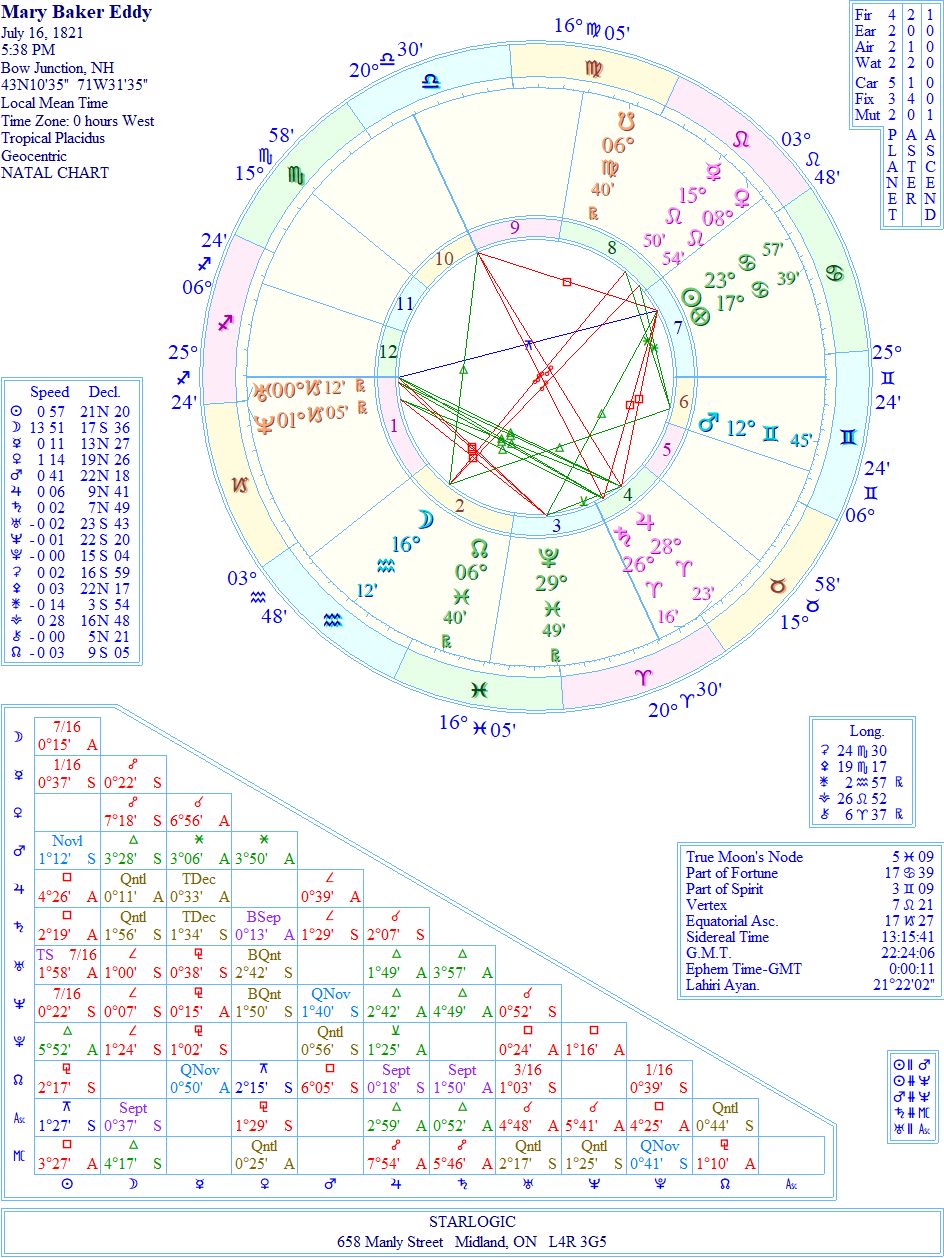 This chart was already on my Kepler 7.0 program, so I’m leaving the timing as it is. Even so, that close conjunction of Uranus and Neptune (in Capricorn) must account for the sickly nature of Eddy as a young infant. Because these planets are trine to Jupiter and Saturn conjunct (in Aries), she may have truly believed she was connected to Jesus. There is no other way I can express this: her delusions may have been so ‘real’ to her that she created a whole ‘new’ science to explain them. There is one inconjunct.