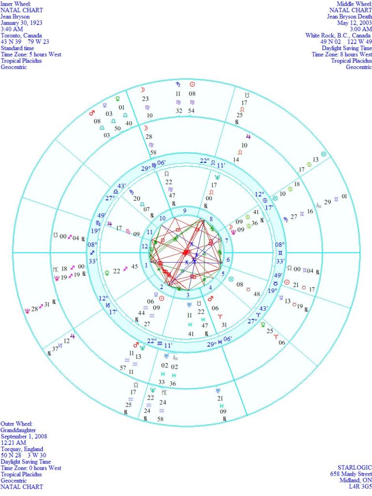 For the past few years, I’ve been researching/experimenting with birth and death charts to see if anything in them can demonstrate connections of a reincarnational kind. I’ve been overwhelmed with the ‘proof’ lately, so I think the penny finally dropped yesterday. I decided to compare/combine my mother’s charts with my granddaughter’s birth chart. Here they are: