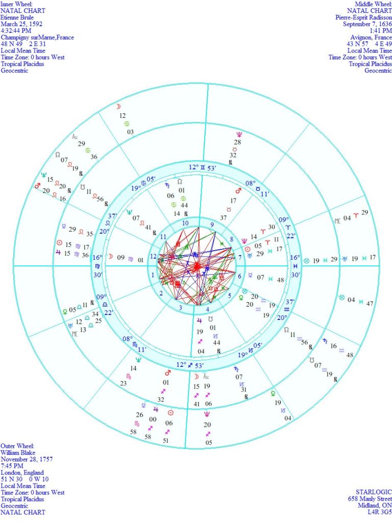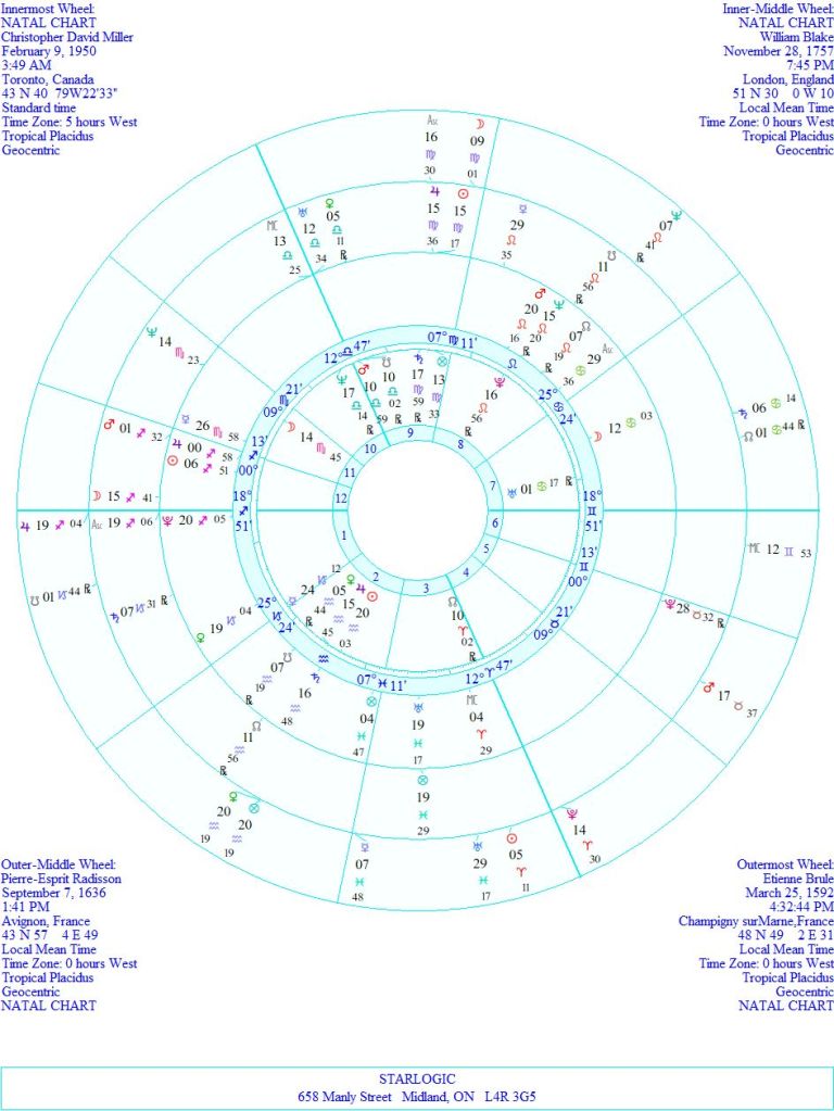 William Blake’s birth chart shows significant connections with both Radisson’s birth and death charts, but it doesn’t look like ‘proof’ until you put all three birth charts together.