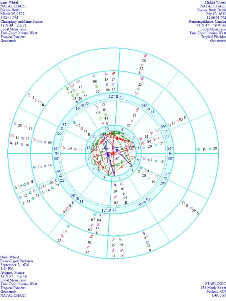 Because Étienne Brûlé’s death date is unknown, we cannot totally rely upon the connections with Radisson’s birth chart, but, even so, there would seem to be significant links, with both Brûlé’s birth and death charts.
