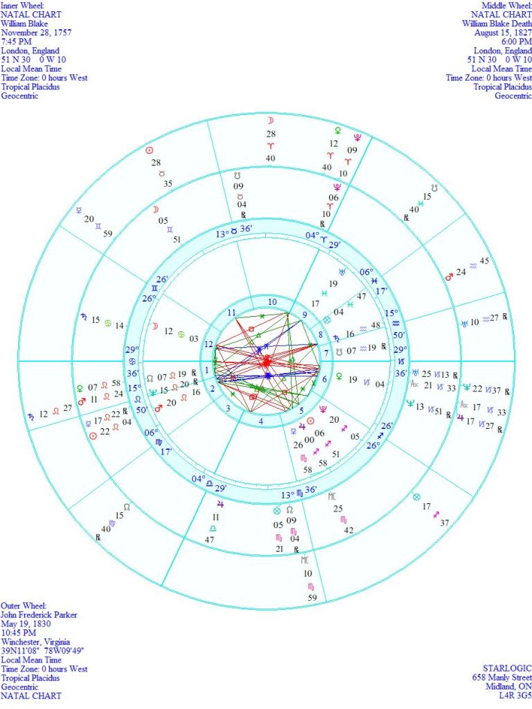 One might wonder why William Blake would go this way, and I suspect it was his run-in with the law that ended with him having to answer a charge of sedition in court. His ‘fatal’ Pluto is conjunct Parker’s natal Pluto (but again, this is no surprise since Pluto is the slowest moving planet in our solar system). The ‘fatal’ Mars in Blake’s death chart @ 11° Leo is conjunct Parker’s natal Saturn @ 12° Leo. And Parker’s Midheaven is conjunct Blake’s ‘fatal’ North Node.