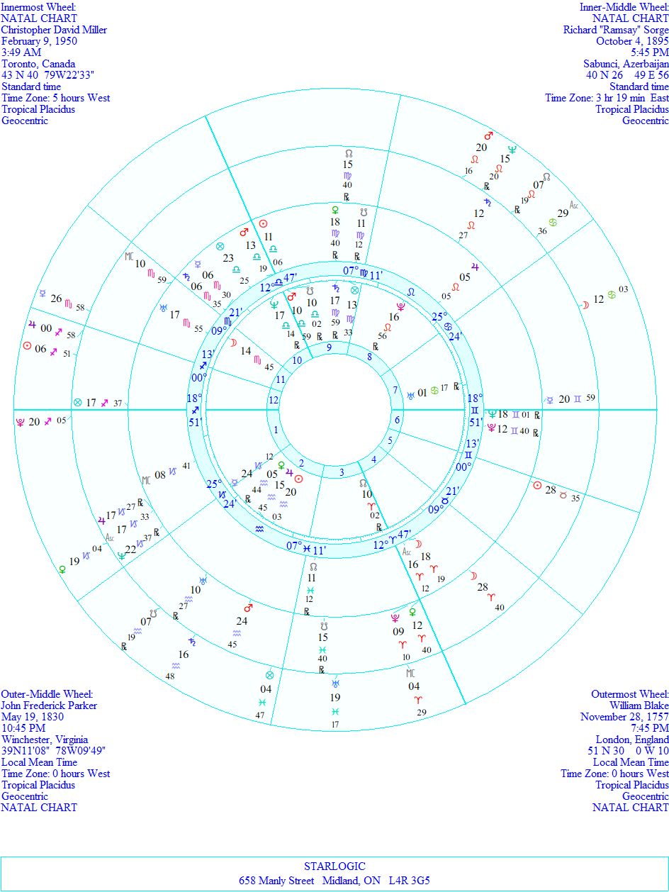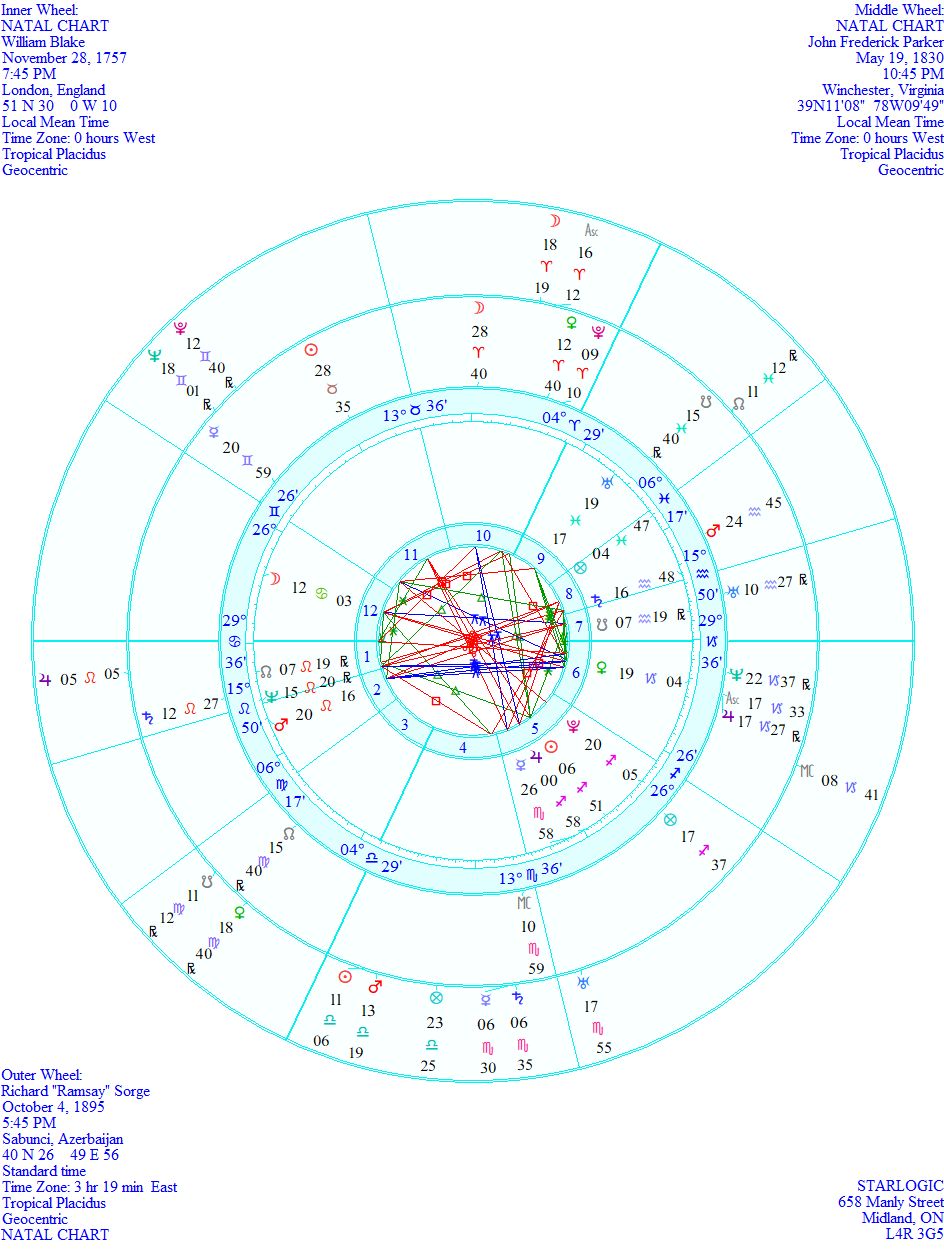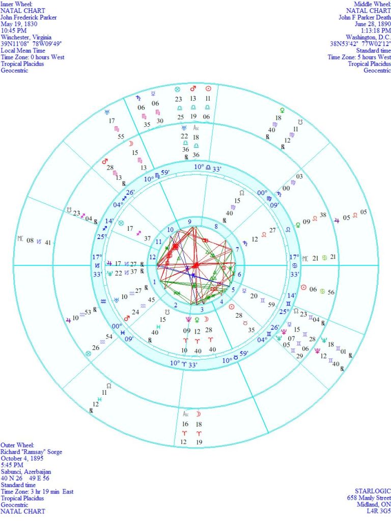 Once Parker’s life was finished, it’s not surprising that he should come back as “Ramsay”, the spy who became the model for James Bond. Parker’s ‘fatal’ Uranus is conjunct Sorge’s PoF.