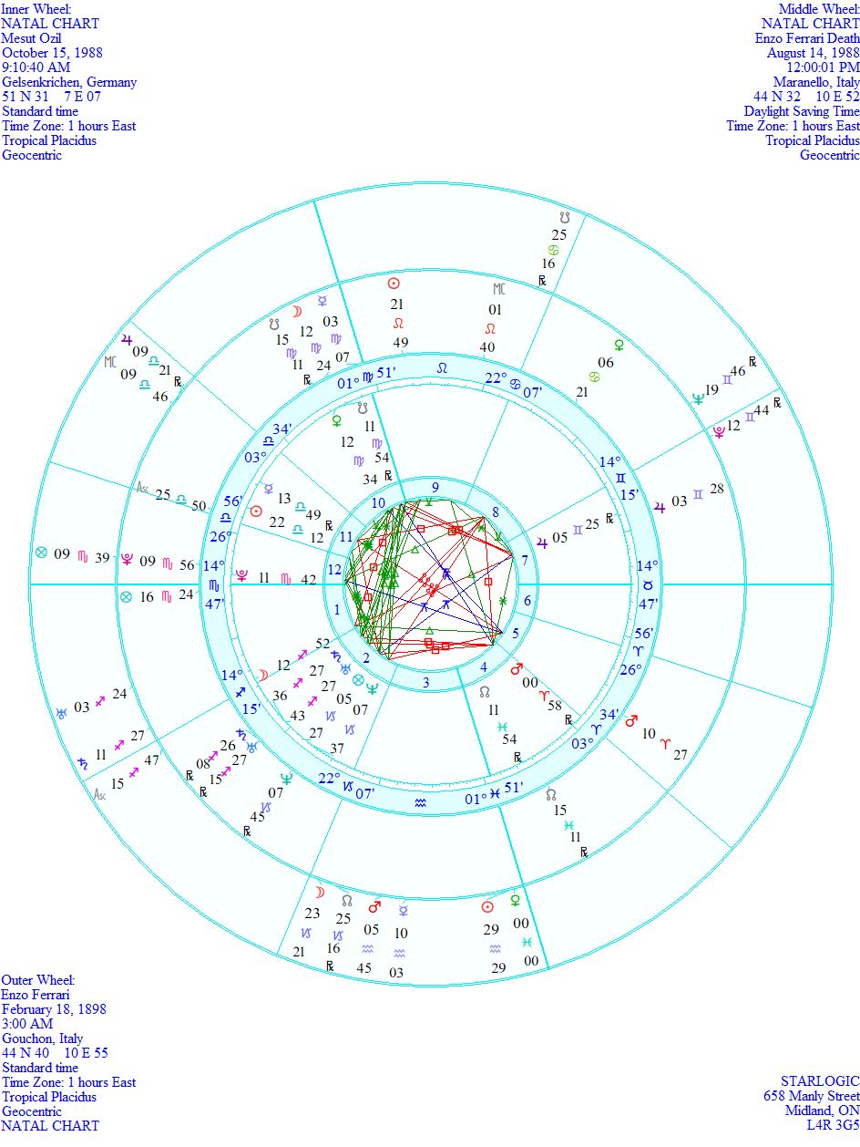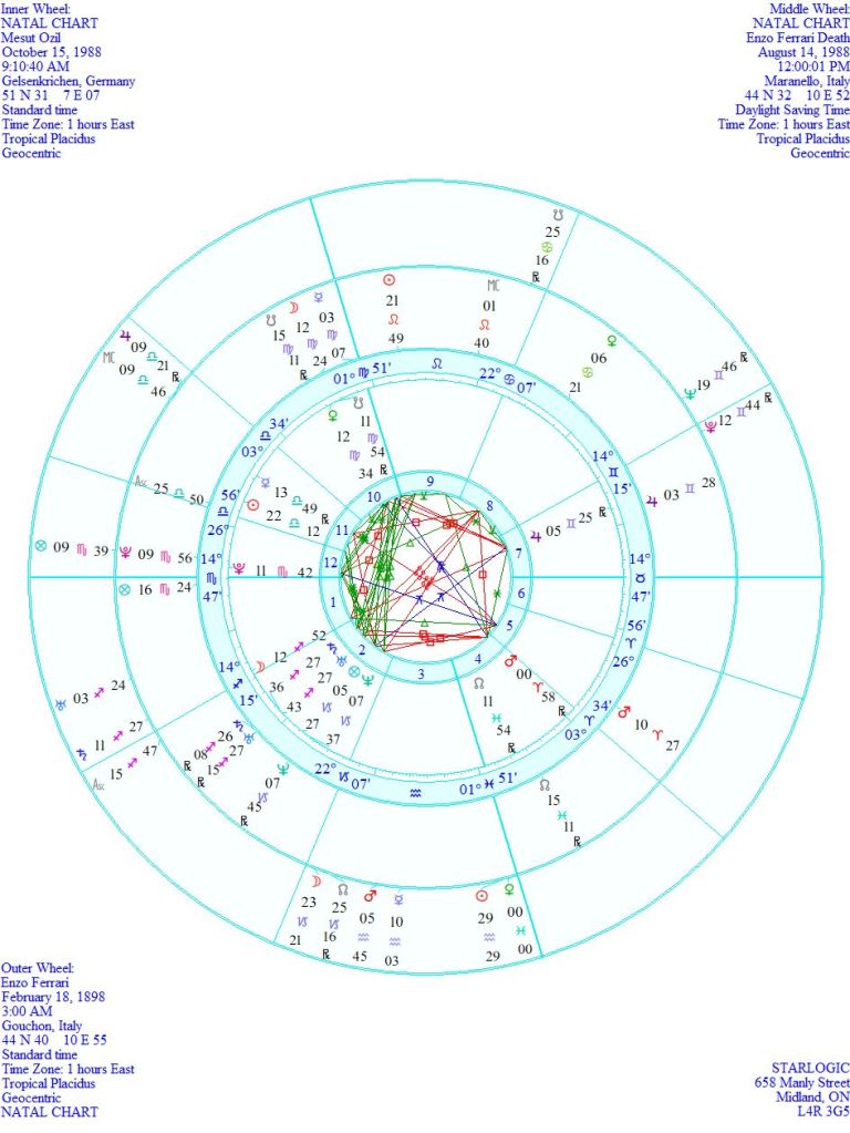 I couldn’t resist taking a look at these two after finding this image today. My Kepler 7.0 computer program had Enzo Ferrari‘s birth chart already, with a 3 am birth time. I made up his death chart based at 12 noon on the day he died. Mesut Özil‘s birth time is randomized.