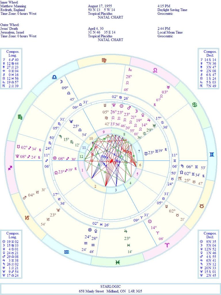 This one may be a bit of a stretch, because I don’t believe that Manning thinks he’s connected to Jesus. But he did, early on in his career, find that he had the healing touch, so let’s review the connections, anyway: the most obvious to me is Manning’s PoF being (almost) exactly conjunct Jesus’ ‘fatal’ Pluto, and both conjunct Manning’s Ascendant in Sagittarius. At the same time, Manning’s Pluto and Sun are conjunct Jesus’ ‘fatal’ Ascendant in Leo. That makes Pluto the common element between them. Interesting. Because their placements of Uranus are conjunct (although in different signs), I see their ‘energies’ as being connected, but different.