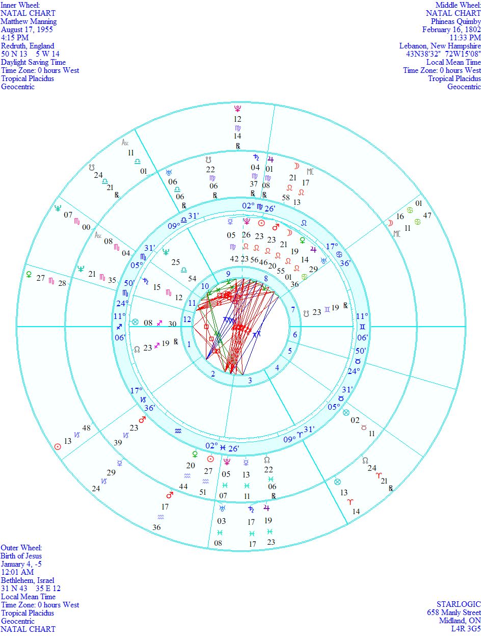 The strongest visually is the conjunction between Quimby’s Ascendant and Jesus’ Neptune, followed by Manning’s Neptune and Jesus’ South Node. Quimby’s Neptune is conjunct Jesus’ Uranus (opposite Manning’s Mercury) while Quimby’s North Node is conjunct Jesus’ Jupiter. And let’s not forget that Quimby’s Mercury is just 4° from Jesus’ Saturn. When the North or South Node is conjunct any planets, there is a sense of reincarnation, so I cannot rule it out, but I am mindful that others’ belief systems won’t tolerate the idea of Jesus reincarnating.
