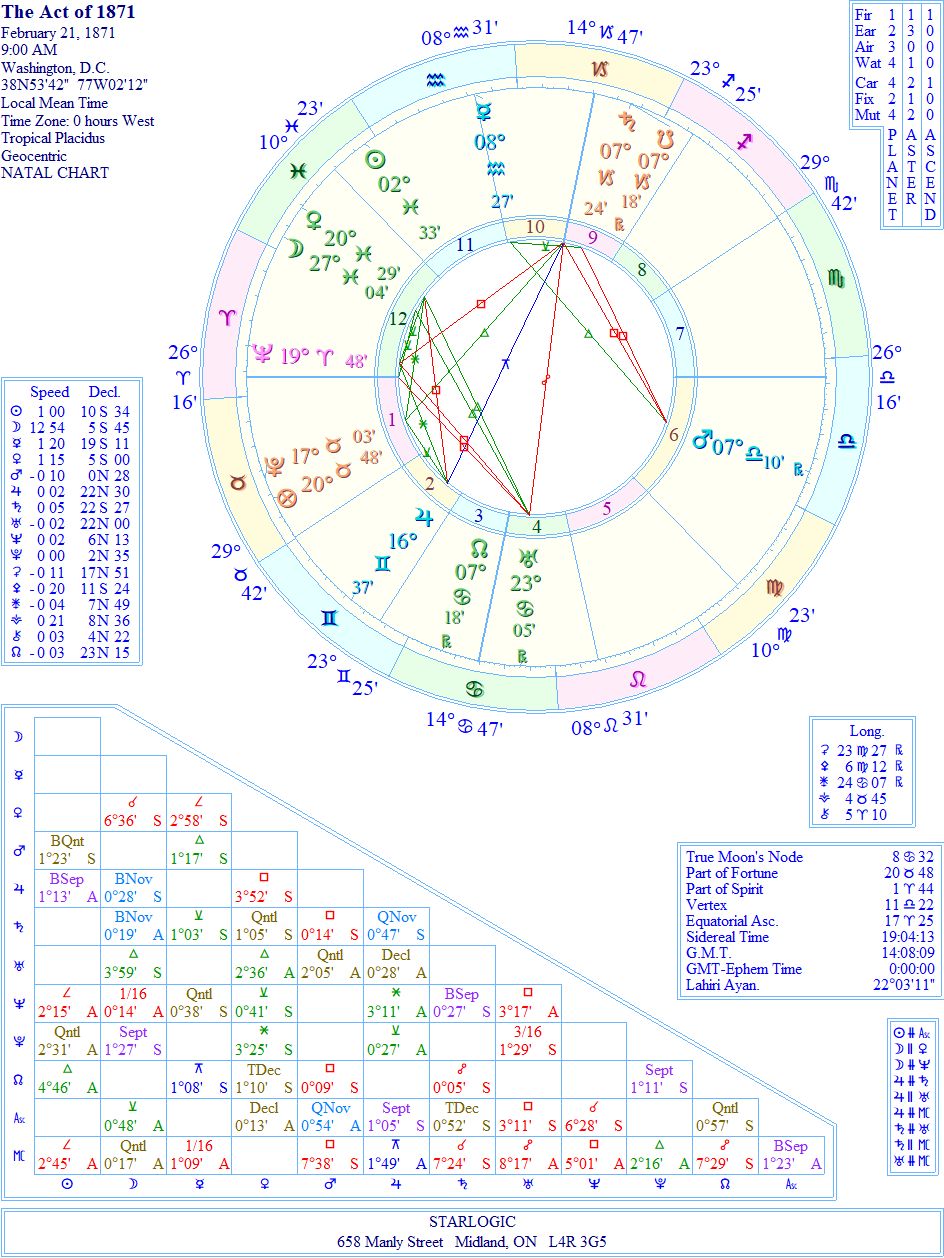 My choice of 9:00 am for the signing of this Act was ‘inspired’. The proof is the pivotal position that the Midheaven takes, and especially that Jupiter inconjunct Midheaven.