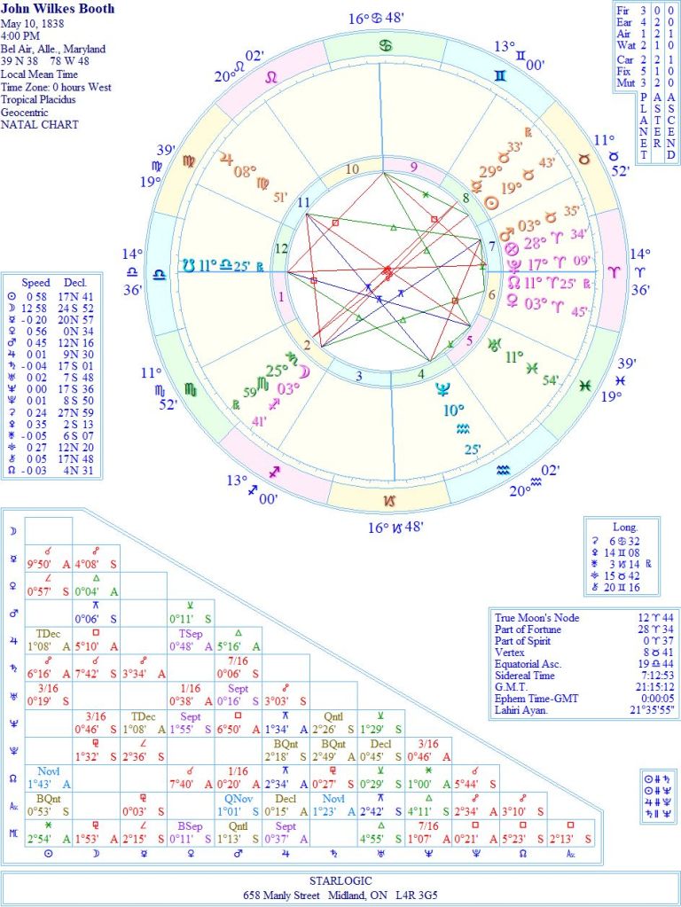 This chart was on my computer program already, so I haven’t changed the time, and when we look at the placement of the planets here, we can see that Booth was radicalized at around age 25 (Pluto in Aries). There are three inconjuncts.