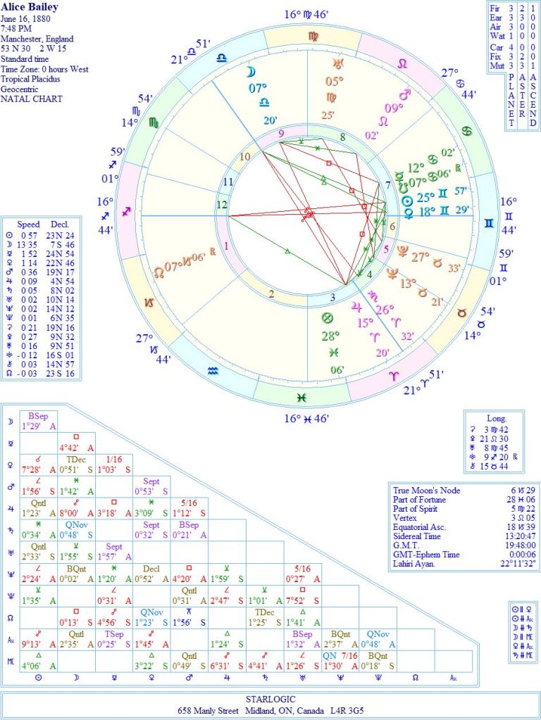 Alice Bailey’s birth time is uncertain, but has been stated as 7.42 am by Dane Rudhyar, one of the twentieth century’s foremost astrologers. Originally the time was said to have been given to him as 7.32 am – from Alice Bailey herself, a personal friend. Later Rudhyar rectified the time to 7.42 am. The Astrodatabank website quotes the following:“The time was long quoted as 7:32 GMT, also by Taeger, who quotes Penfield and Rodden … reports by email from the original article by Rudhyar, that Rudhyar’s corrected chart has 11 Leo ascendant and 20 Aries MC … this is consistent with a birth time of 7:42 GMT.”