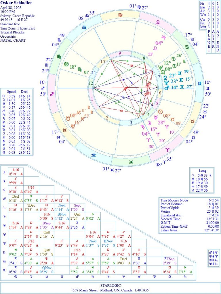I had originally randomized the timing, but in doing so, I saw a line-up of planets that make sense when you tie them to events in his adult life: becoming a spy for the Nazis (Mars) at about age 25, and moving to Krakow, Poland (Venus/Pluto) by age 31. I almost couldn’t believe my eyes when the Yods pointing at the Sun and Ascendant suddenly appeared. (But I need to remind you that they only exist if the time is correct…)