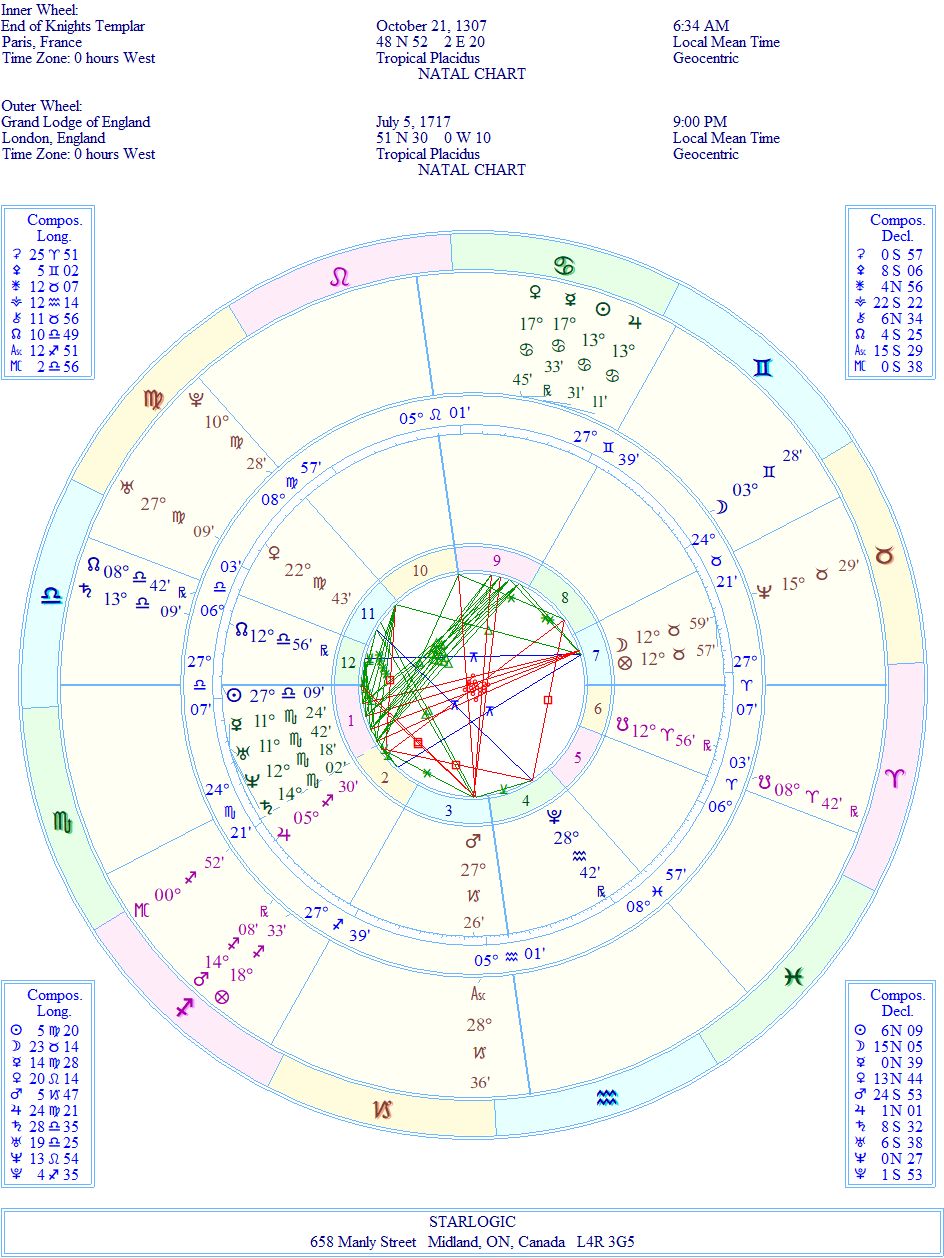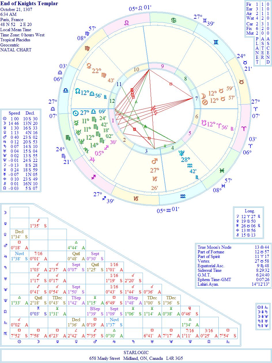 I don’t know about you, but I get a queasy feeling when I think of that Friday the 13th in 1307. And just before dawn, it would be the normal time to get up, so they wouldn’t even have had time to put their armour on. Yes, they would have been at their most vulnerable. The Part of Fortune @ 13° Taurus (conjunct the Moon) is very auspicious. They would have been totally opposite the stellium of four planets (Mercury, Saturn, Uranus and Neptune) arrayed between 11° and 14° Scorpio, forming T-squares with the Midheaven @ 5° Leo. And Mars @ 27° Capricorn is opposite the Midheaven, and forming T-squares with the Sun/Ascendant conjunction @ 27° Libra. Pluto also gets in on the act by being trine to both the Sun and the Ascendant. Venus is trine Mars; Jupiter is trine the Midheaven. (And Chiron is the midpoint of an intercepted Pisces 9th House.) This is no accident!