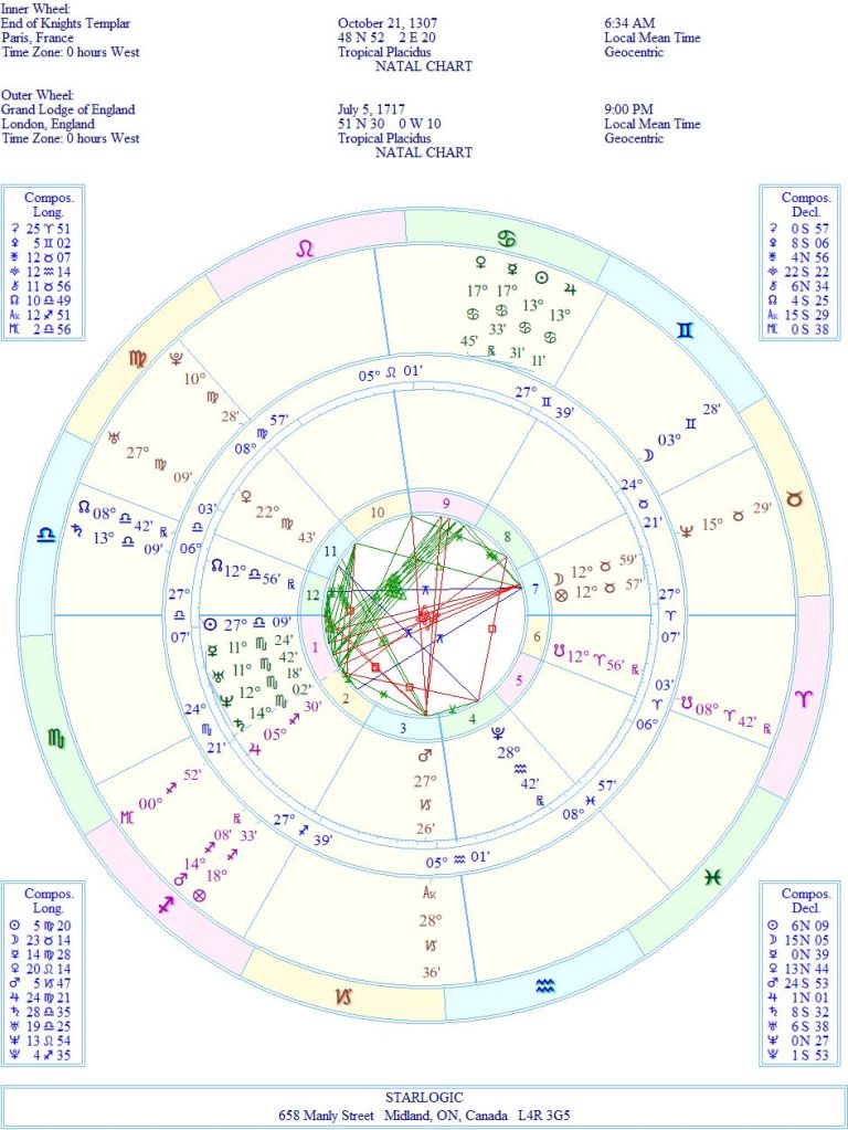 If these were two individuals across time, I would say that they are connected astrologically. There are five contact points: ‘fatal’ Mars conjunct natal Ascendant; ‘fatal’ Moon conjunct natal Neptune (forming an interactive Yod); ‘fatal’ Jupiter conjunct natal Midheaven; and ‘fatal’ Venus conjunct natal Uranus. That leaves the strongest/strangest one of them all: the North/South Node axes in both charts are 4° apart, with the ‘fatal’ North Node being conjunct the natal Saturn @ 13° Libra. Double hmm. The Grand Lodge of England chart has its Part of Fortune very close to my own Ascendant in this life, conjunct its Mars. My ‘peaceful’ warrior energy?