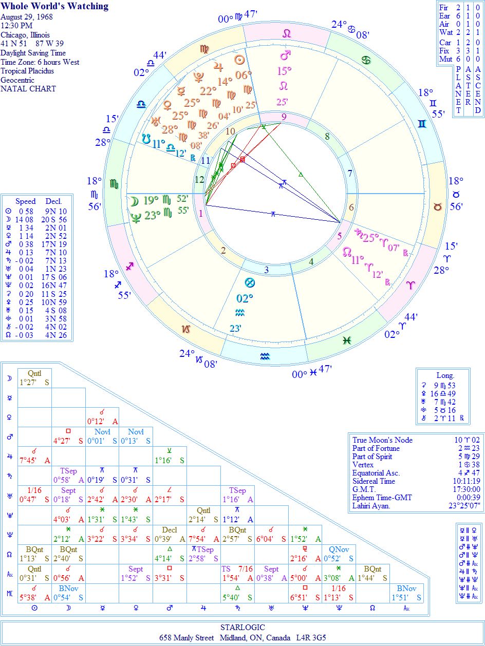 I’ve written about the trial of the Chicago 7 previously. The recording of the crowd chanting “the whole world is watching” took place on August 28, 1968 when the Chicago police surrounded the anti-war protestors outside the Conrad Hilton Hotel where the 1968 Democratic National Convention was being held. Only, there was no live TV coverage of the protest, possibly due to Mayor Daley’s actions. That may be where the blackout idea comes from. So, I’ve set up a chart for the ‘supposed’ blackout/interruption for the middle of the noon hour on the 29th.