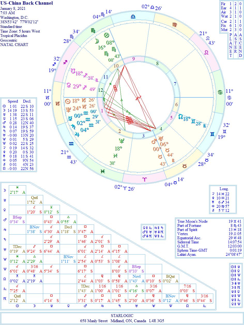 Did he prevent a potential war between the United States and China? You can bet he did. That Mars/Uranus (“lightning strike”) conjunction is the ‘proof’ of what was potentially going to happen. And the triple T-square connecting these two planets in Taurus with the Midheaven @ 4° Scorpio and the Mercury/Jupiter/Saturn conjunction in Aquarius shows that it would have totally consumed the American people had it taken place. Yes, folks, they dodged the ‘bullet’: the World War III postponed…