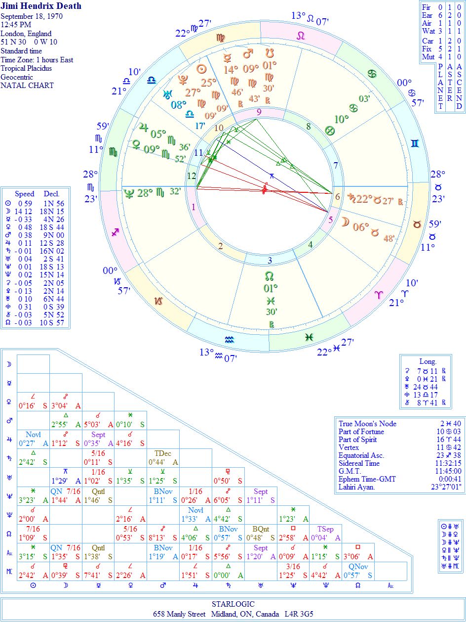 That Neptune @ 28° Scorpio 32′ (transiting the Ascendant) lends this event its mysterious aura. At the same time the Moon is inconjunct Uranus, not a good sign either. Did Monika overdose him, or did he willingly take 18 times the recommended dosage of Vesparax? At any rate, he aspirated his own vomit, which is never a good way to die. The coroner left it as an open verdict.