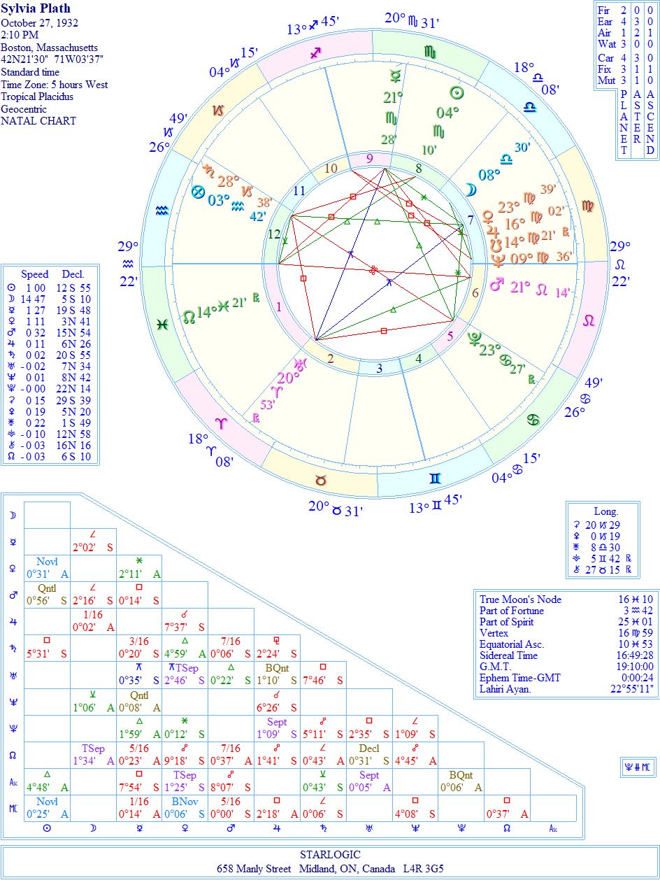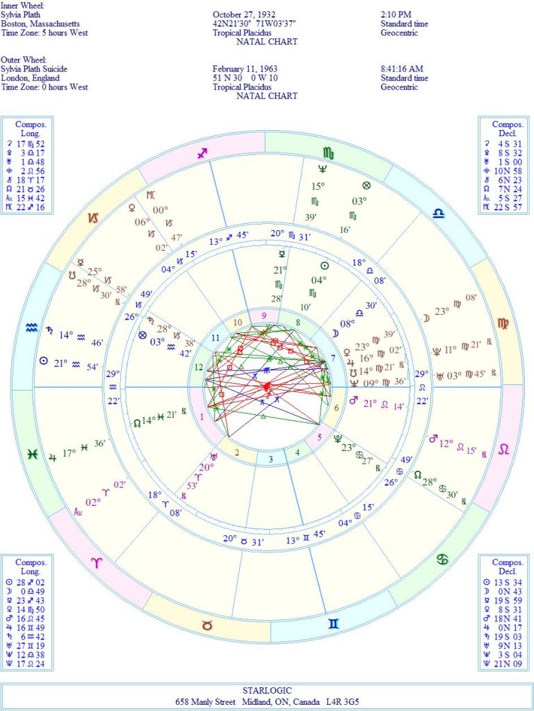 This chart was already on my Kepler 7.0 program, so I’m leaving the timing as it is. Where Mars is in her birth chart may represent her falling in love with Ted Hughes. But it may also represent her conflict with the world and its uncle. Saturn conjunct the 12th House cusp may be the source of her mental issues. Saturn is opposite Pluto in the 5th House.