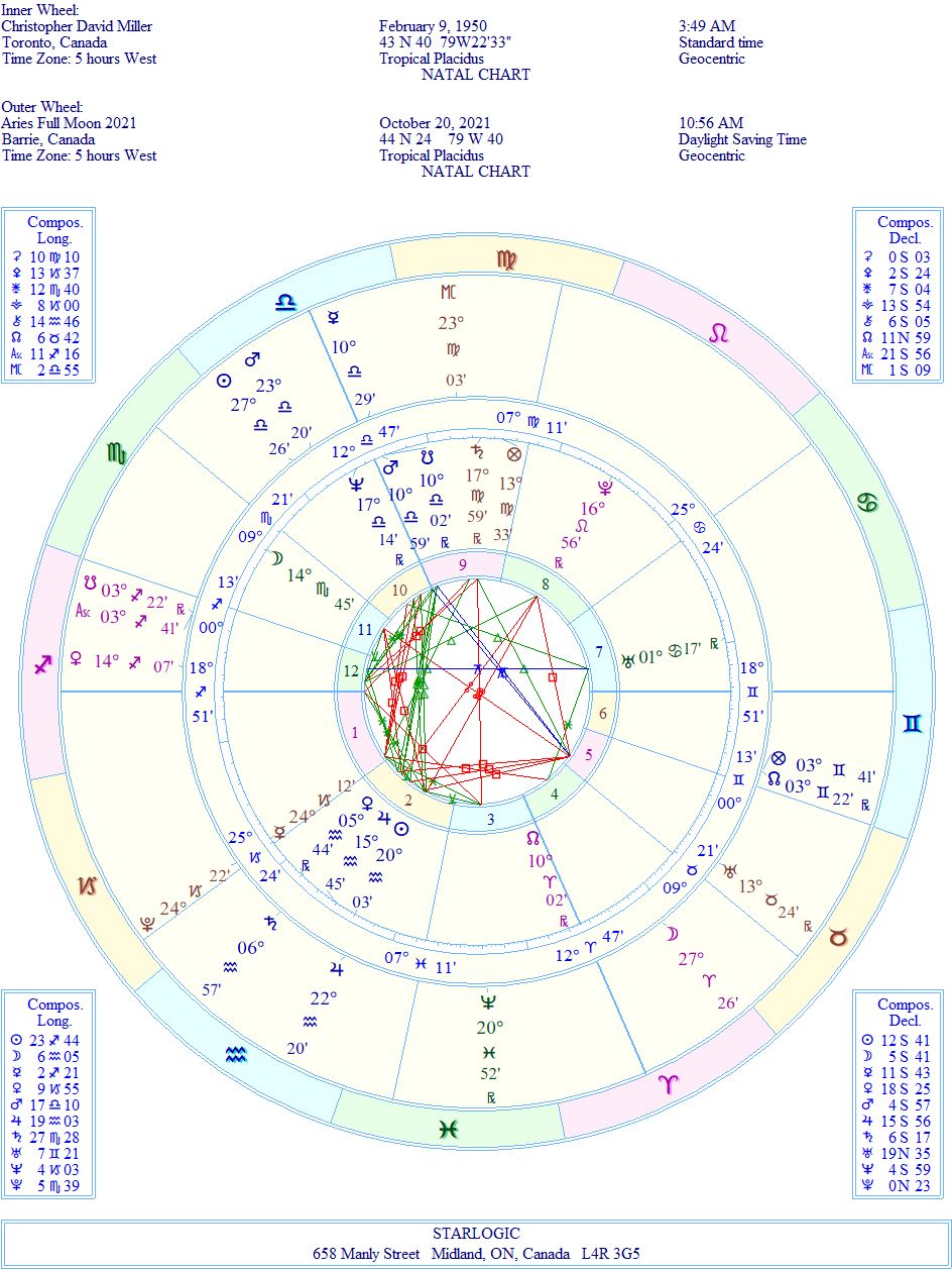Should I be saying ‘oh-oh’? My natal Mercury and transiting Pluto are taking a long time to part company, so I’ve been feeling that tension for quite a while now. What’s new is my natal Mars/South Node conjunction is being transited by the event Mercury @ 10° Libra, and my natal Venus is feeling the restriction of a transiting Saturn. The only redeeming feature of these two charts combined is my natal Sun still being conjunct the event Jupiter. So that’s ‘lucky’. But, just to be sure that something emotional is probably going to occur, my natal Moon is opposite the event Uranus. Oh-oh, for sure.