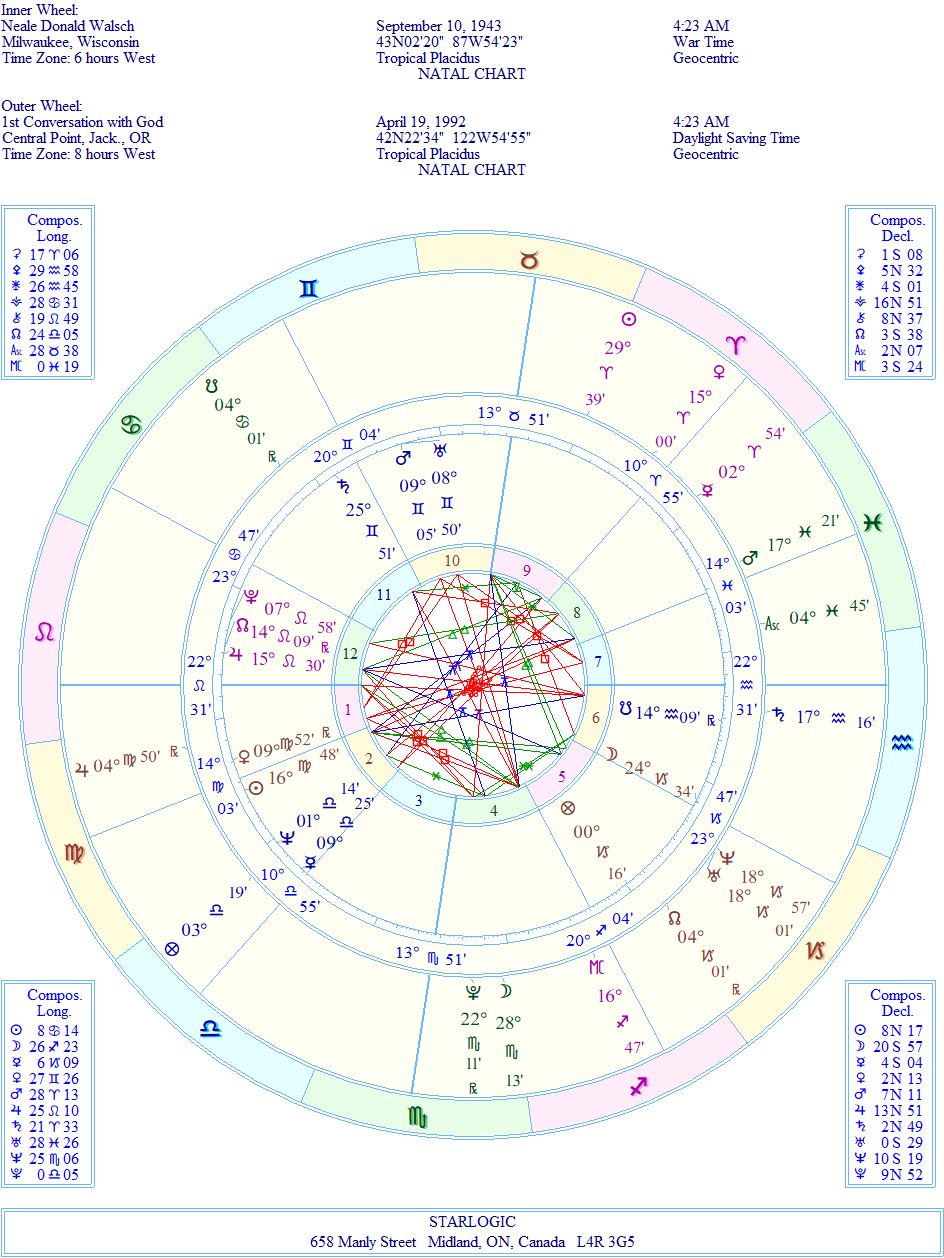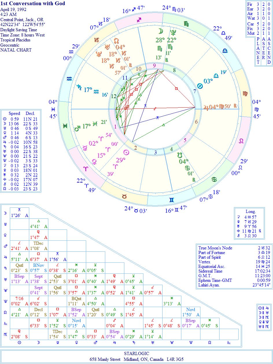 Walsch sates that it was around Easter of 1992 that the first conversation began. I have decided to focus on Easter Sunday of that year, to demonstrate the energies that were around him, at the time. Notice what planet is on the Descendant: Jupiter. It is inconjunct Mercury. The Sun @ 29° Aries is inconjunct the Moon @ 28° Scorpio. Hmm.