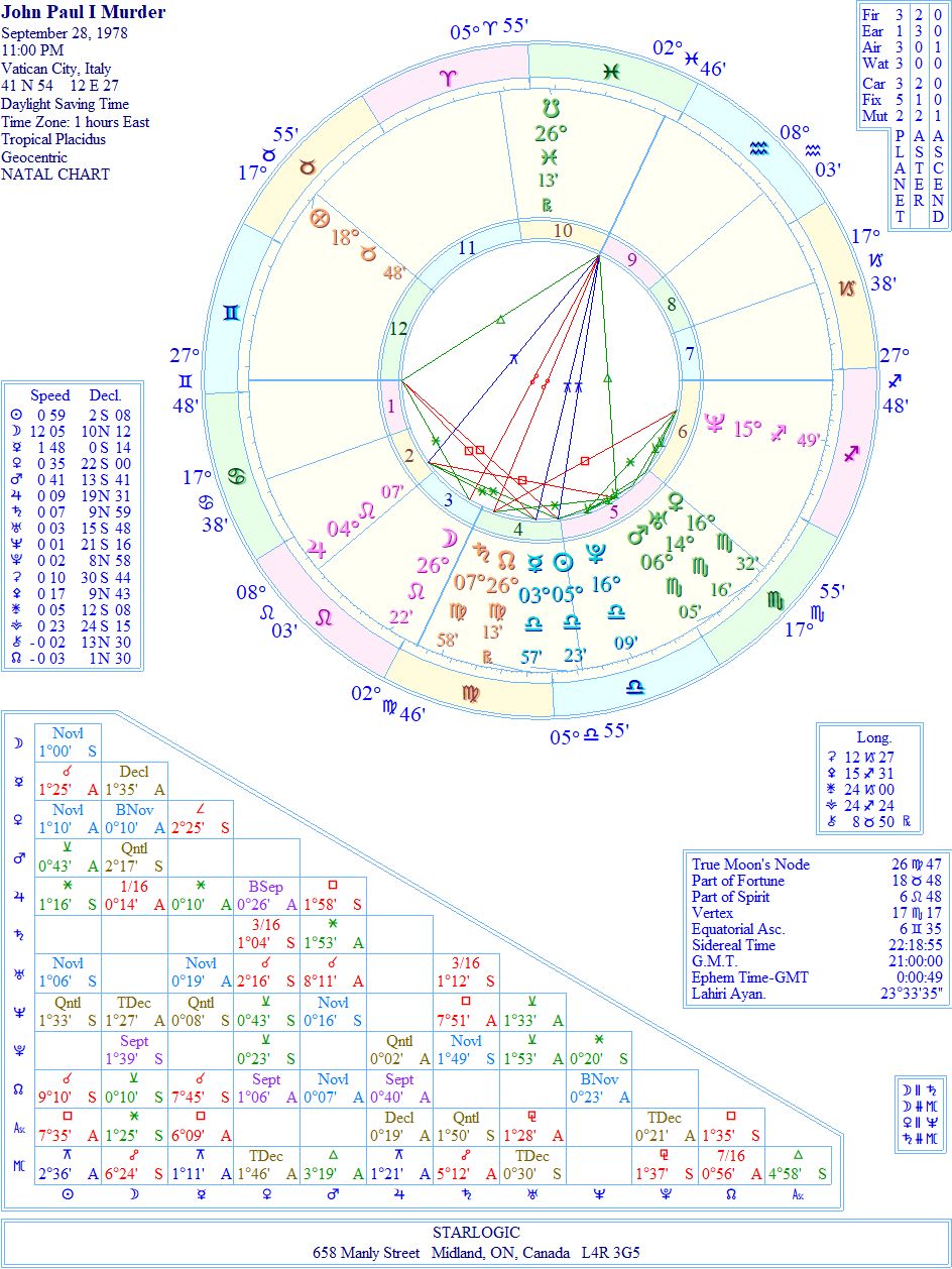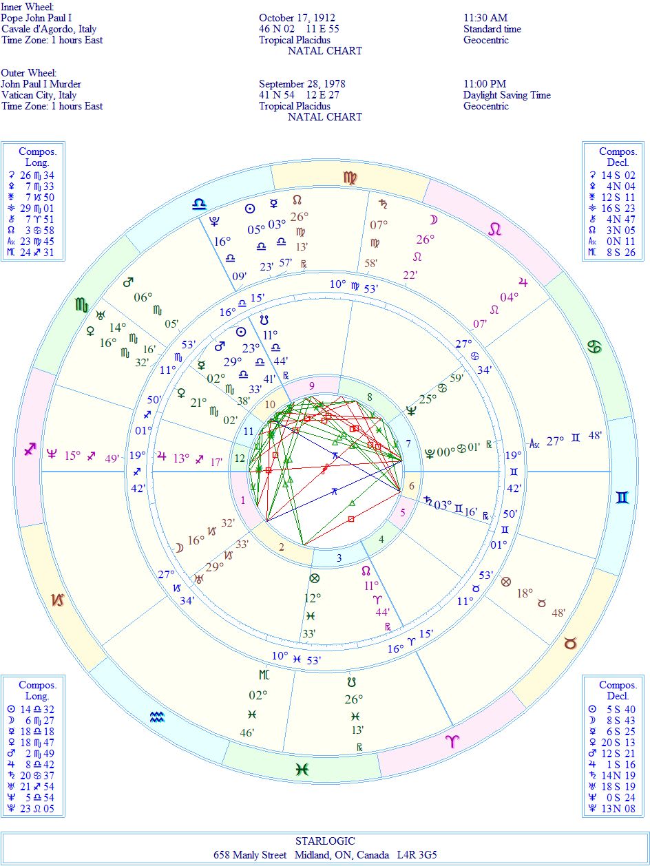 So, just to be clear, I am in ‘two minds’ about the proof. If the Moon and Saturn hadn’t been in opposition to the Midheaven, this might have been an ‘open-and-shut’ case. The trines from Mars @ 6° Scorpio and the Ascendant (to the Midheaven) keep nagging at me to look for more clues. By rights, Mars in Scorpio is enough to suggest that the rumour is true. It also turns out that Neptune is actually transiting Pope John Paul I’s natal 12th house, conjunct his natal Ascendant @ 19° Sagittarius: