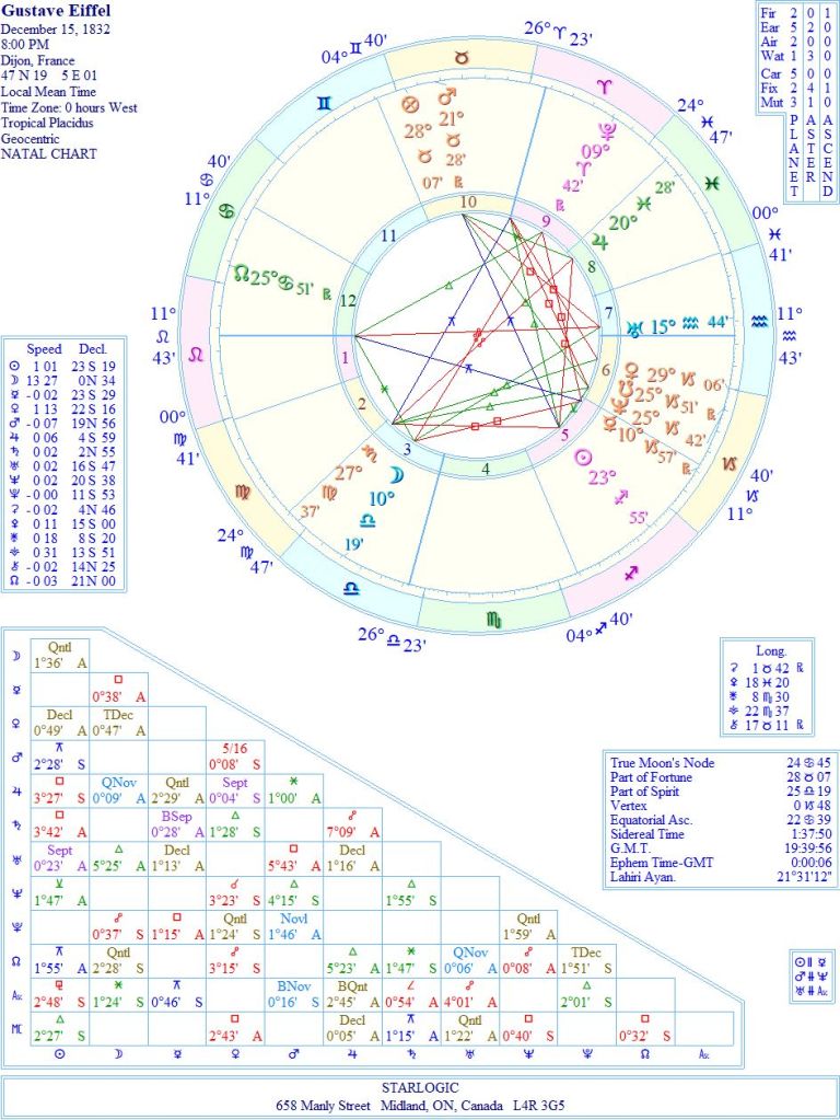 It must have been an attention-getter to have my dream consciousness suggest that Eiffel was the devil. So I knew I needed to have accurate birth details (which, surprisingly, my Kepler 7.0 program did).