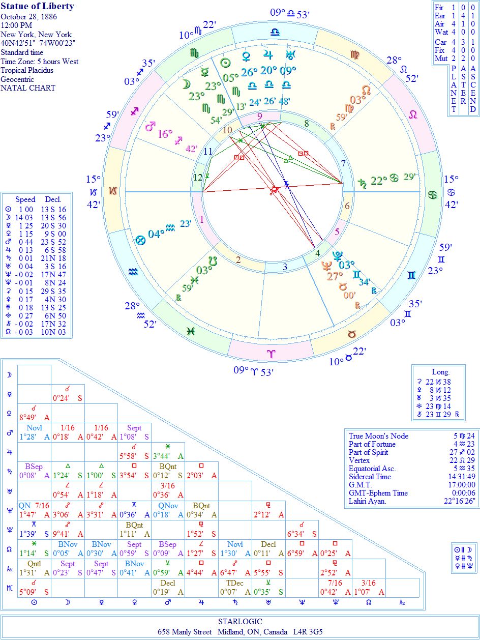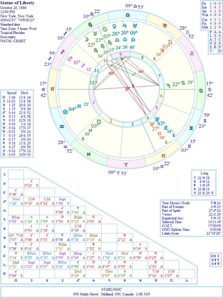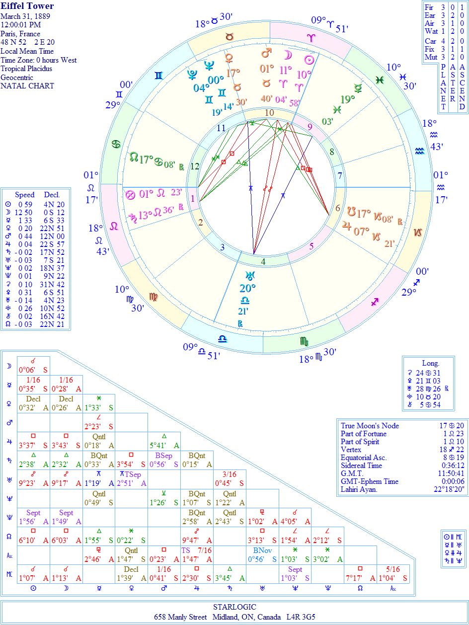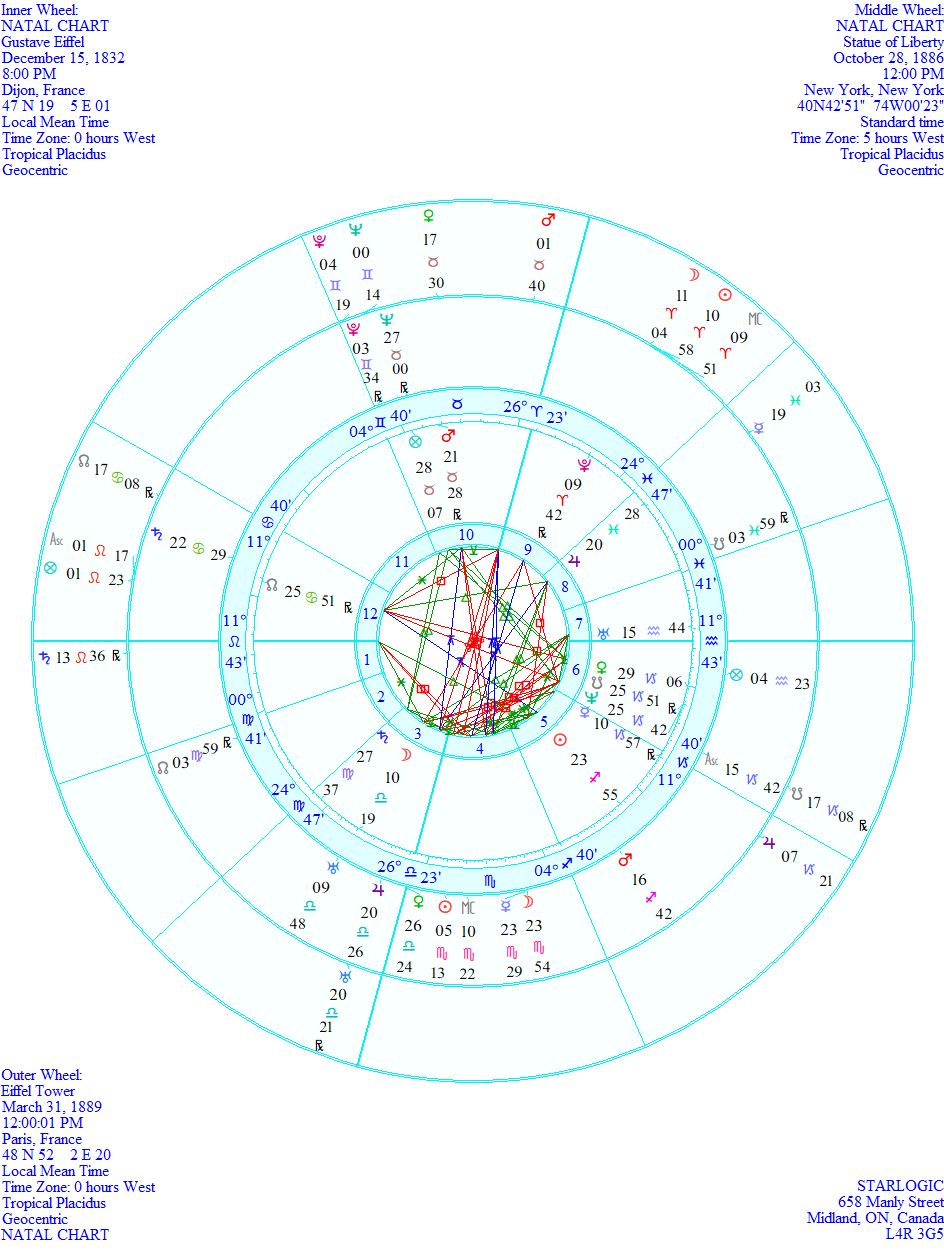 Eiffel’s Part of Fortune @ 28° Taurus is conjunct Liberty’s Neptune @ 27° Taurus and the Tower’s Neptune @ 0° Gemini. They are all situated in Eiffel’s 10th house of Career. Couldn’t be better stated.