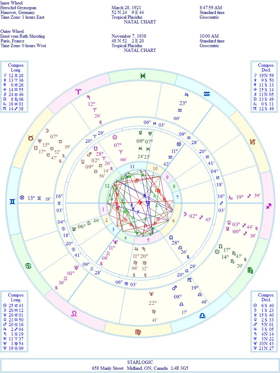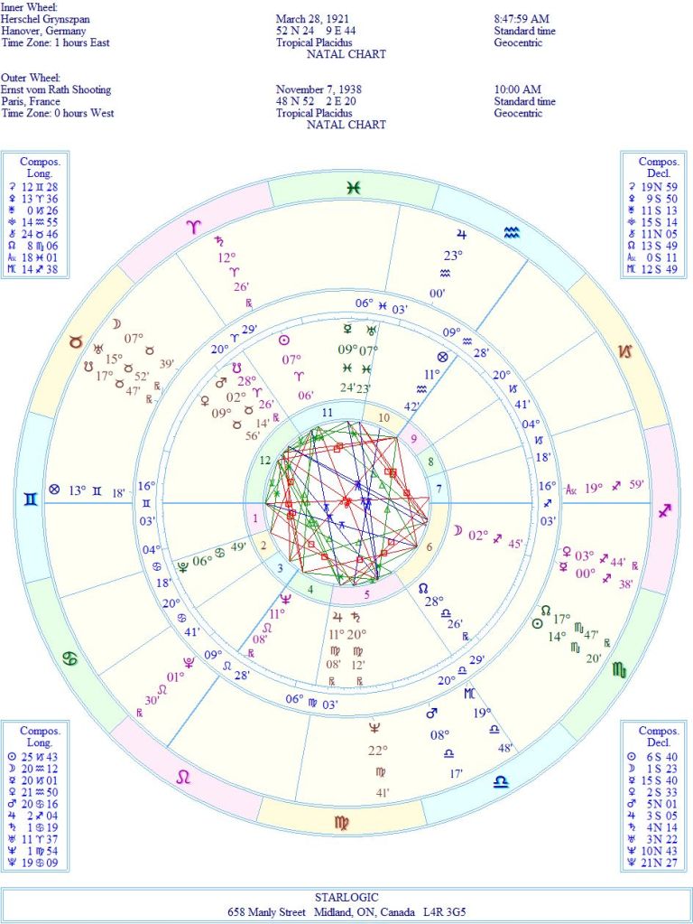 The timing of this ‘event’ is set @ 10:00 am on a whim. Because the energies for this day are very similar to that of the Kristallnacht, I will let it stand alone. Notice that the Moon and Mars are again inconjunct, while the other inconjunct is between Jupiter and Neptune. The lingering doubt was whether this shooting took place as an unprovoked assault. The idea that vom Rath and Grynszpan were lovers comes into play, here. And, if I’m being honest, the possibility that the authorities hoped to kill ‘two birds with one stone’ has come to my mind. But I have no definite ‘proof’, other than by comparing Herschel’s birth chart with Ernst’s shooting.