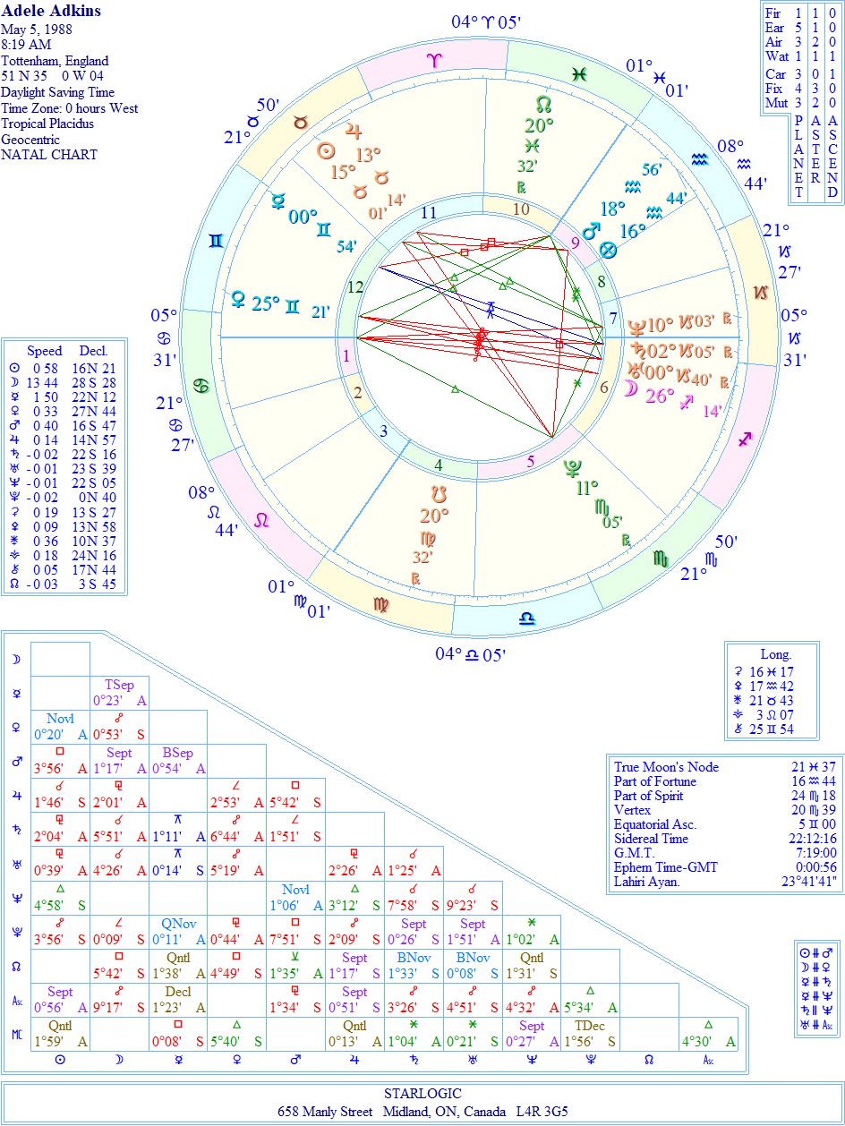 Two birth chart websites have this time of birth for Adele, so I decided to go with it, just to see what would ‘pop out’ at me. And there it was: Pluto @ 11° Scorpio at the age (7) she would have been when that idea suddenly occurred to her. So, that tells me this birth time is accurate for our purposes, here.