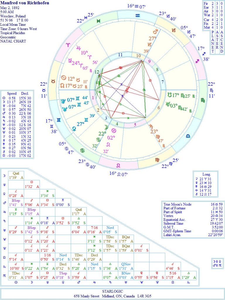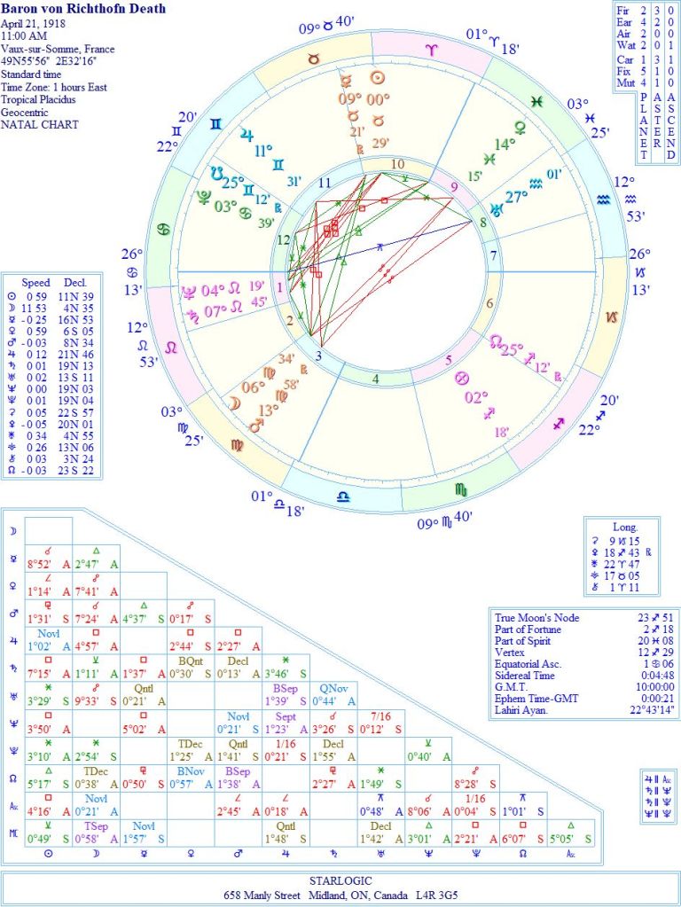 The Uranus inconjunct Ascendant of the Red Baron’s ‘fatal’ chart gives the biggest clue to what happened. I suspect he made a split second decision to chase after May, to protect his cousin, and in the end paid for that decision with his life.