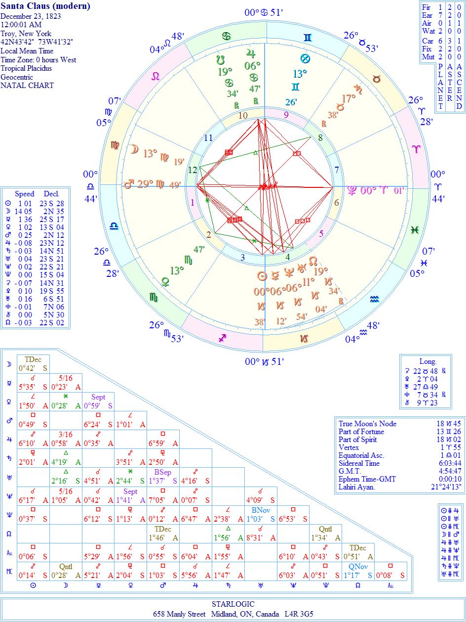 Any astrologer worth their salt would recognize the power of Mars (conjunct Ascendant) in opposition to Pluto @ 0° Aries. It is probably why Santa Claus is such a polarizing figure.