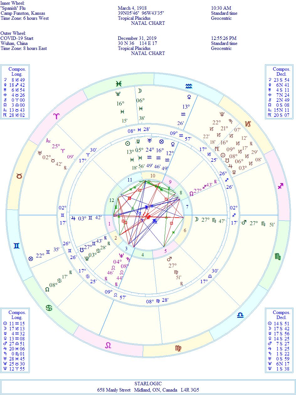 Now doesn’t that beat all?! Venus is conjunct Venus in the charts @ 13° Aquarius (give or take 26 minutes or so). Now I know why I called COVID-19 “The Love Bug”. The other direct conjunction is between the Spanish Flu’s Moon and COVID-19’s Mars @ 27° Scorpio. Perhaps the armed forces were involved this time…